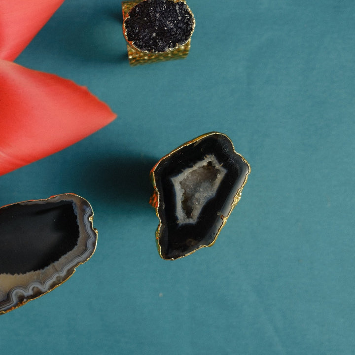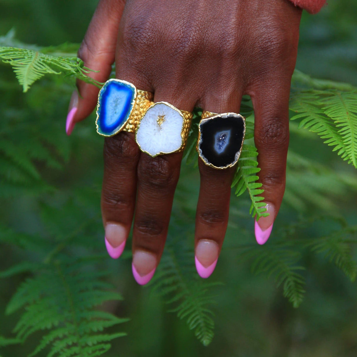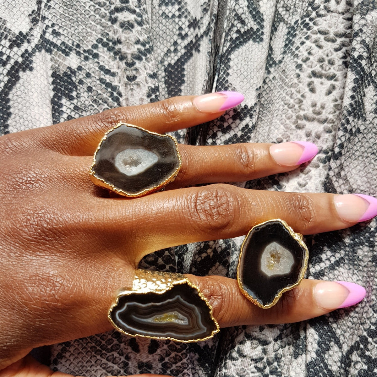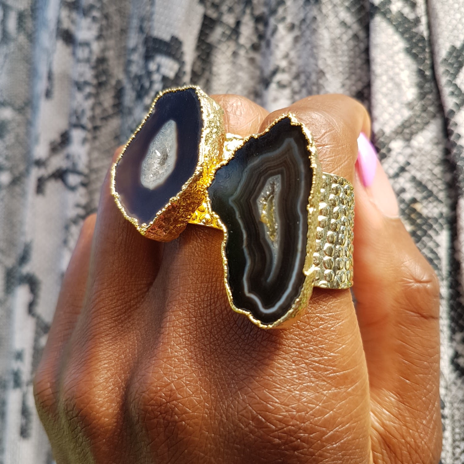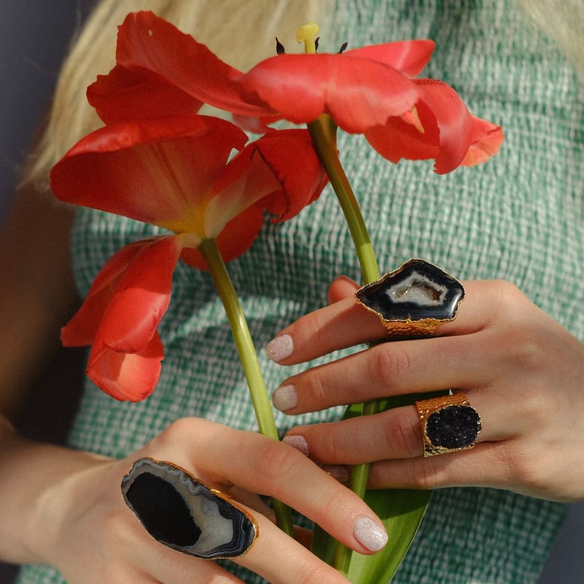 This Black Mega Gemstone Gold Statement Ring by Yaa Yaa London is a bold and unique accessory designed to make a power move. The unique agate crystal gemstone, with its varying color intensities and shapes, is set in a thick, demi-matt gold-plated band, making each ring one-of-a-kind. It's a statement piece that celebrates individuality and natural beauty, perfect for those who want to stand out with a confident, artistic style.