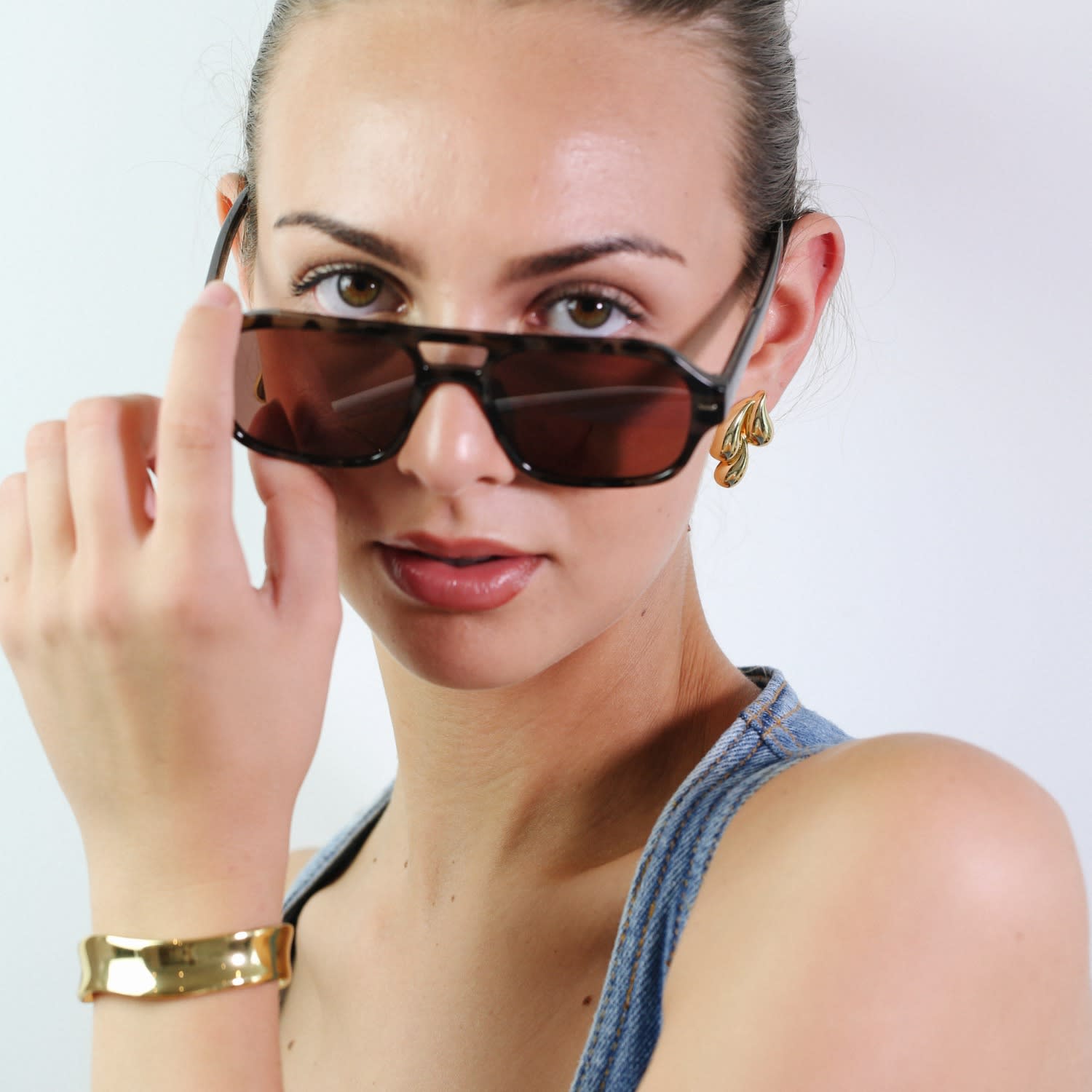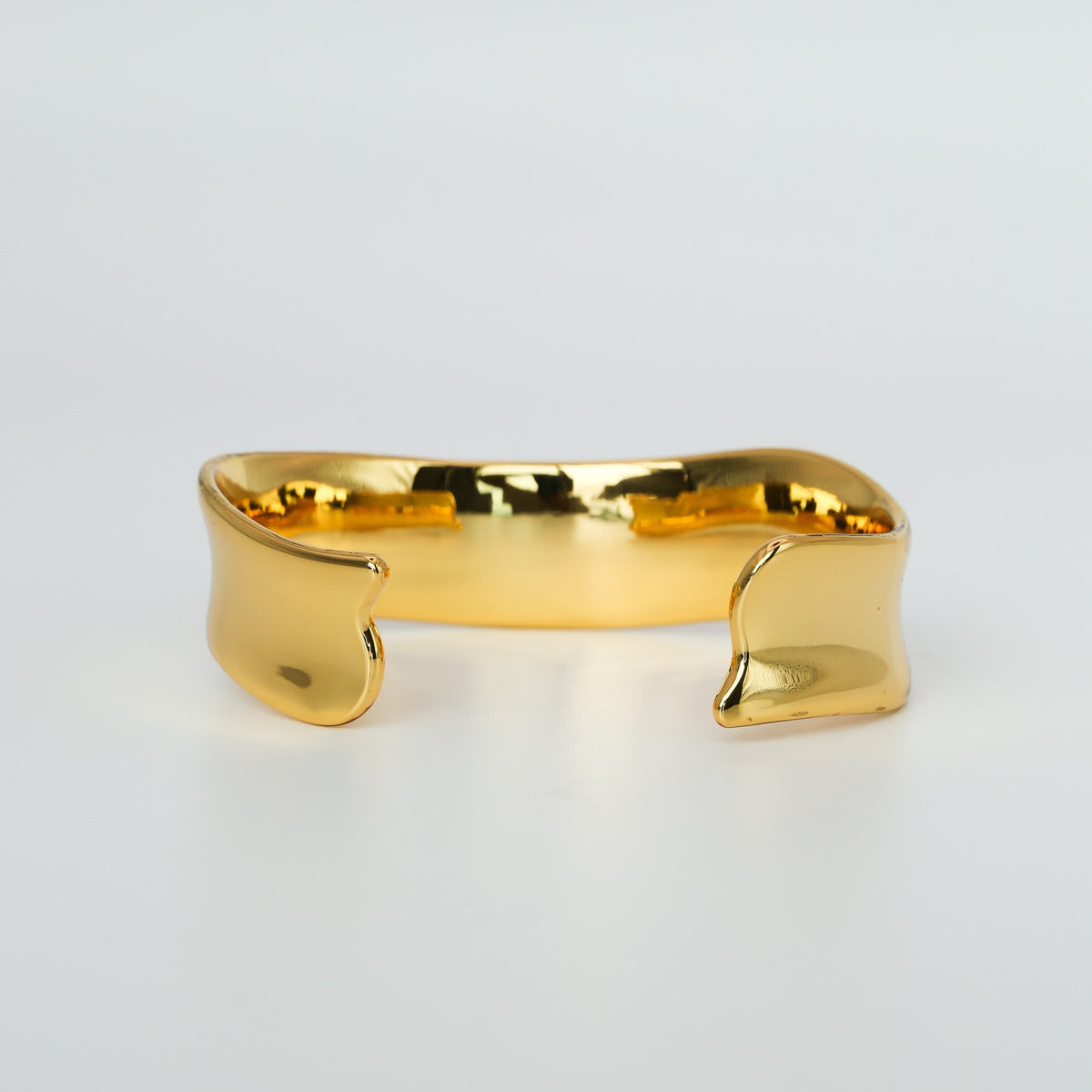 This Gold Curve Cuff Bangle by Miss Cecilia is a modern and minimalist staple. The design features a sleek, refined curve with an elegant closing detail, making it a versatile piece that effortlessly complements any outfit. The cuff's adjustable length ensures a perfect fit, providing both comfort and a secure feel. Its classic yet trendy aesthetic makes it an essential and stylish addition to any jewelry collection. Whether worn alone or stacked with other bracelets, this piece adds a touch of sophisticated polish.