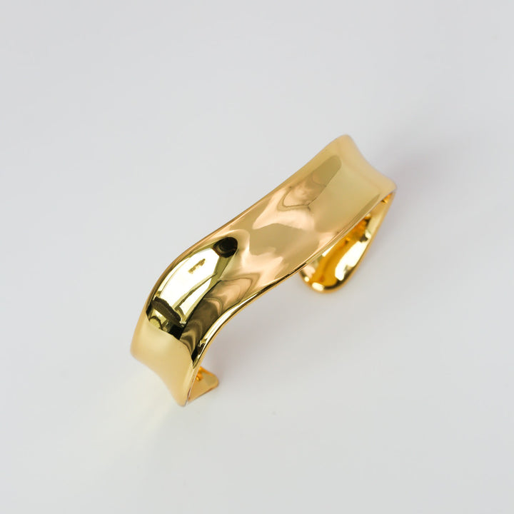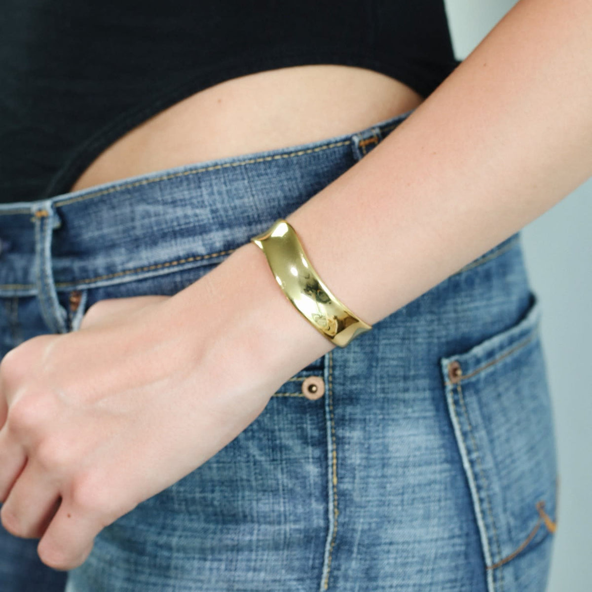 Crafted from brass with 18ct gold plating, this bangle has a width of 1.4cm. It features an adjustable inner diameter of 6cm for a comfortable and customized fit.