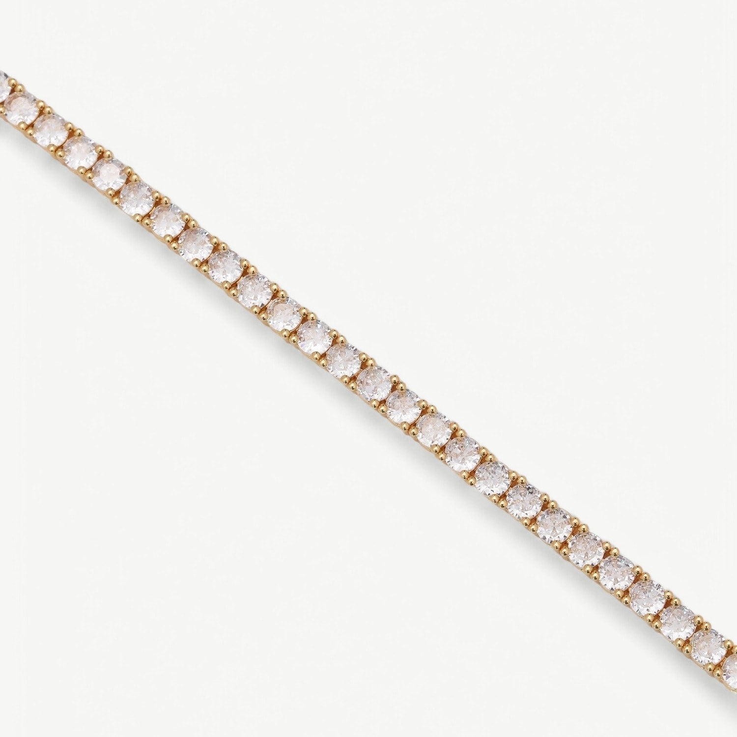 This bracelet is made with 18k gold plating on brass and features cubic zirconia stones. It measures 17cm in length and 0.4cm in width.