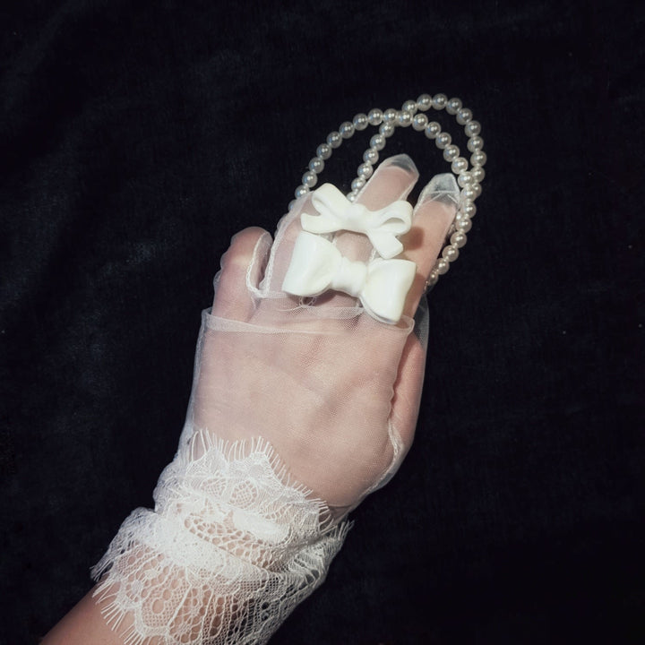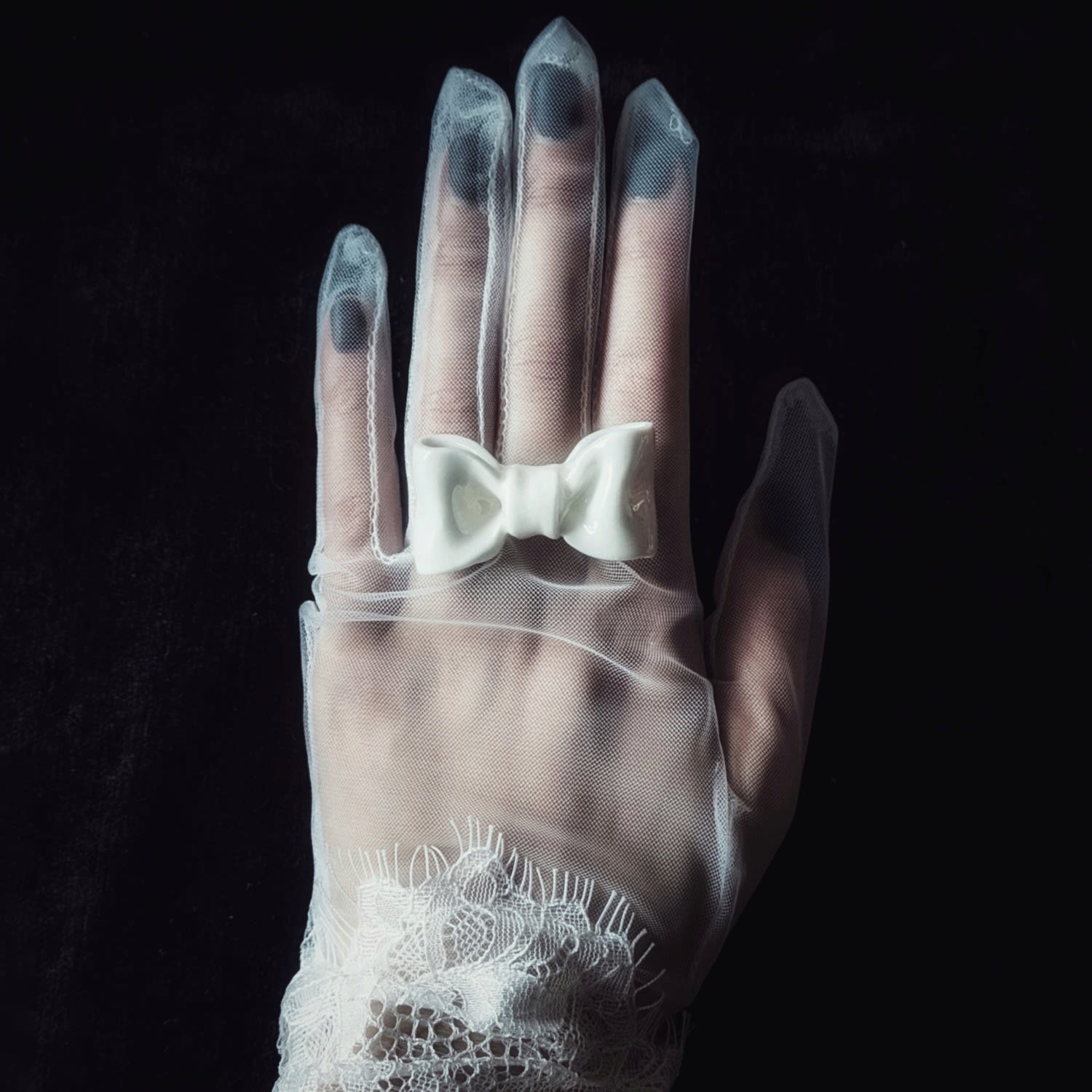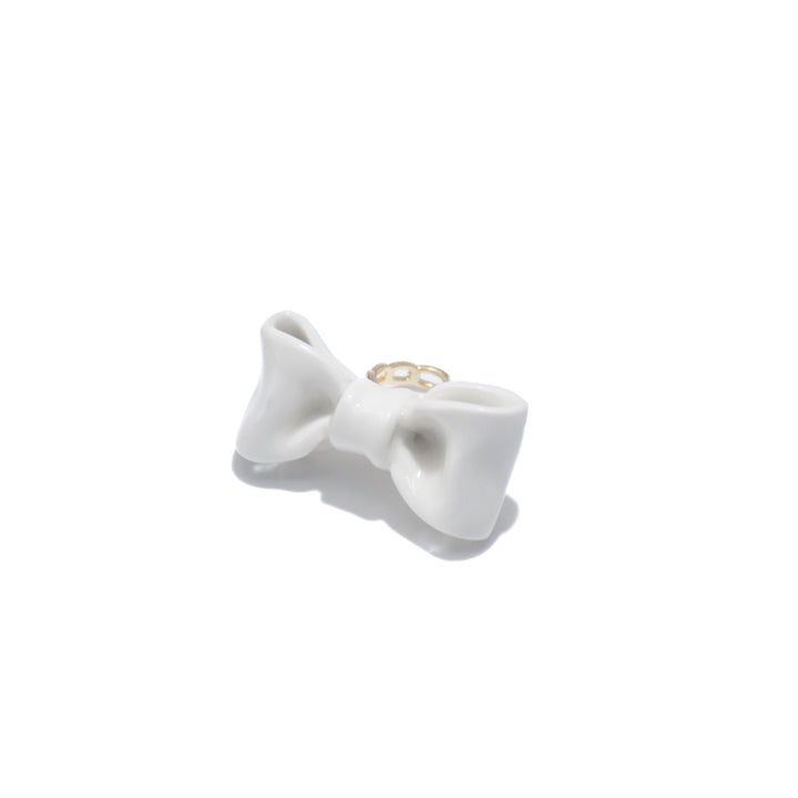 This is an adjustable brass ring with a handmade stained porcelain white stoneware bowtie. Each piece is unique.