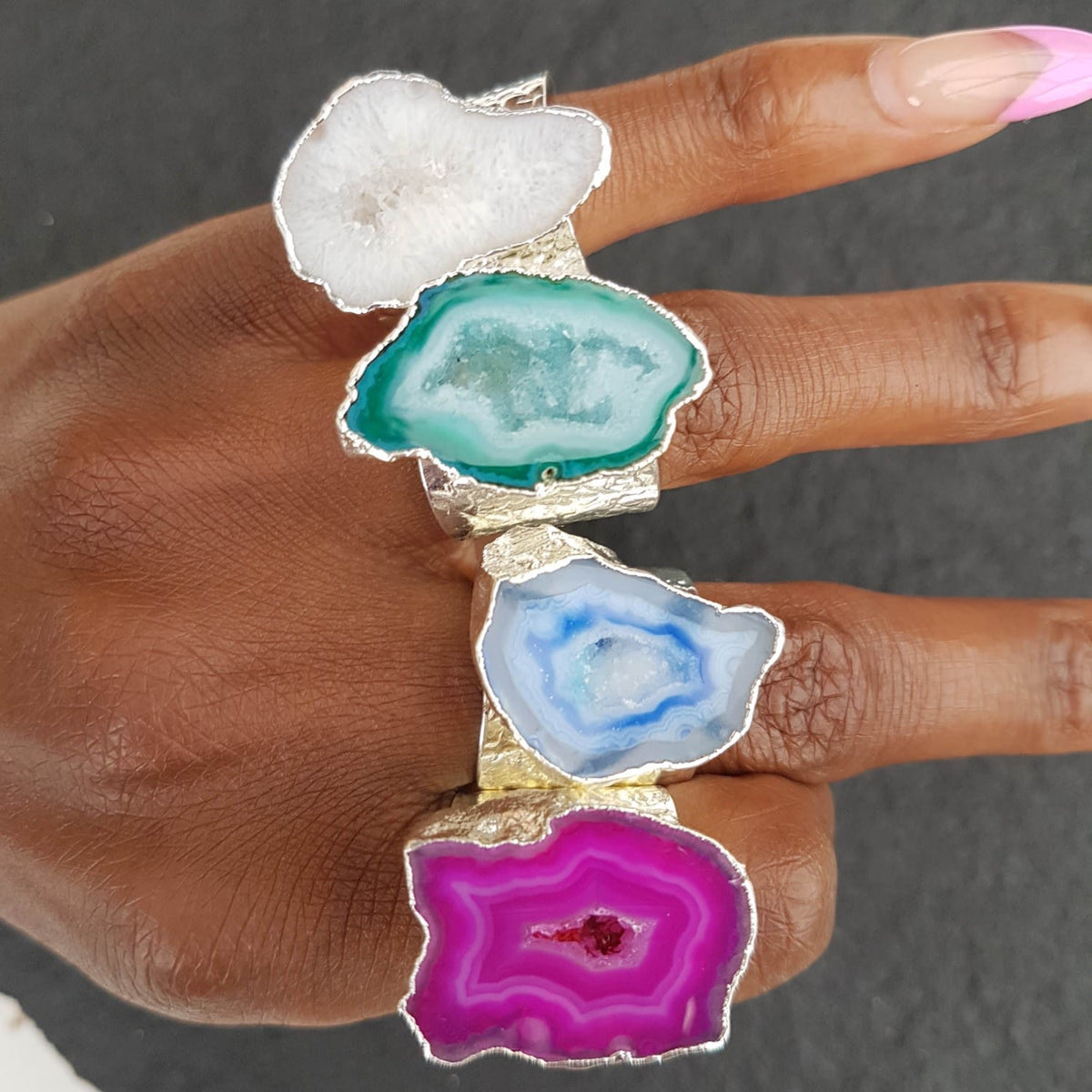 This statement ring features a chunky agate druzy crystal gemstone set in a silver-plated thick band of brass.