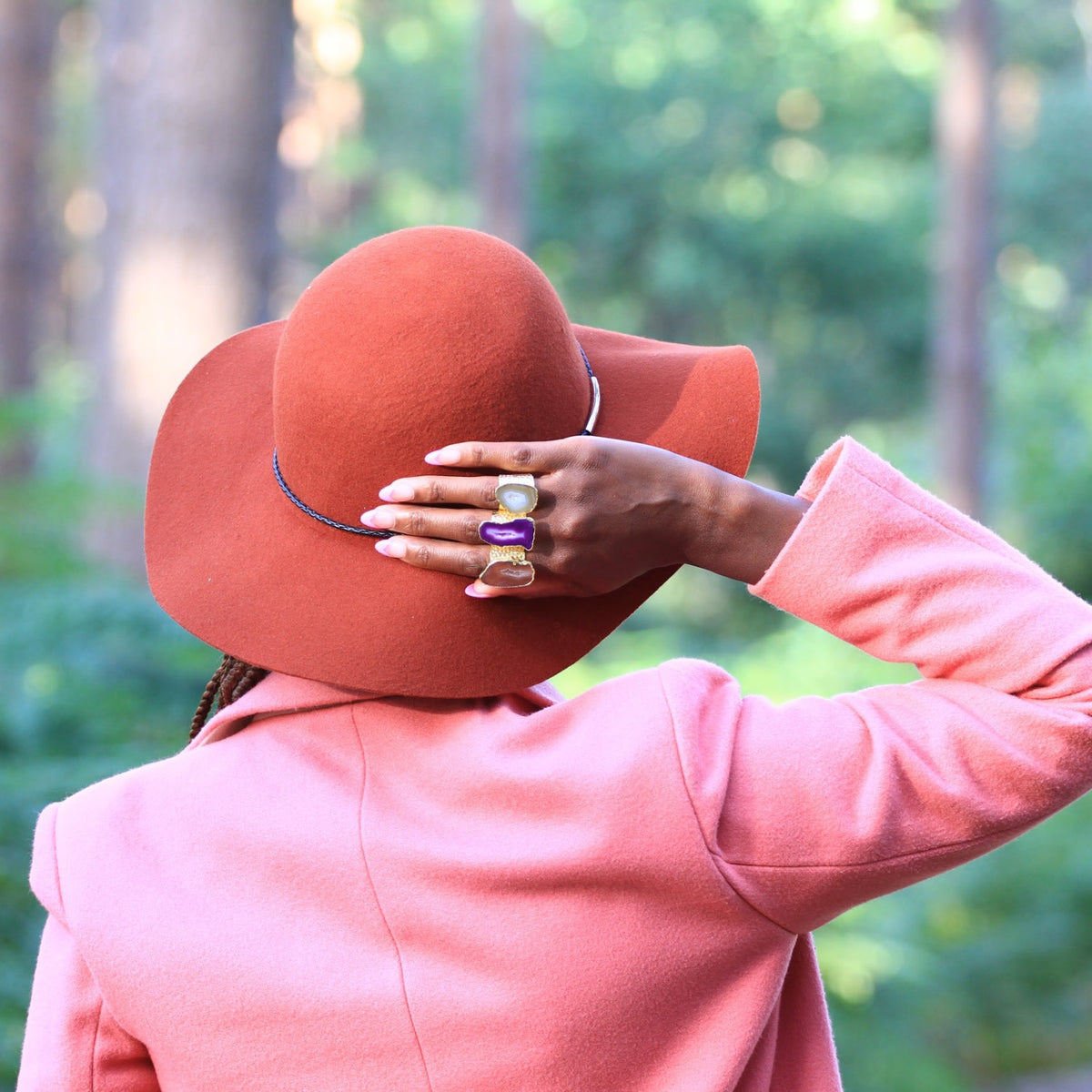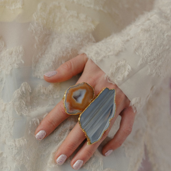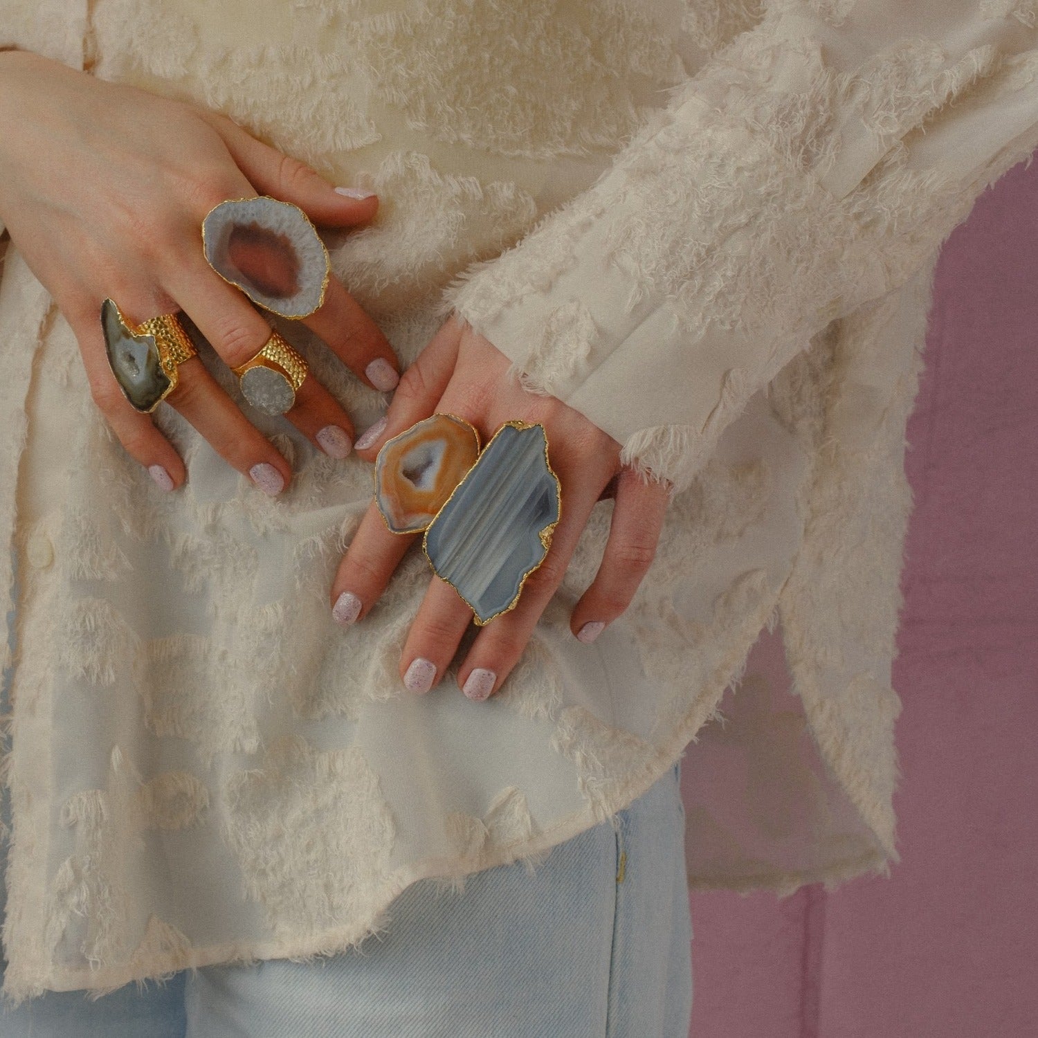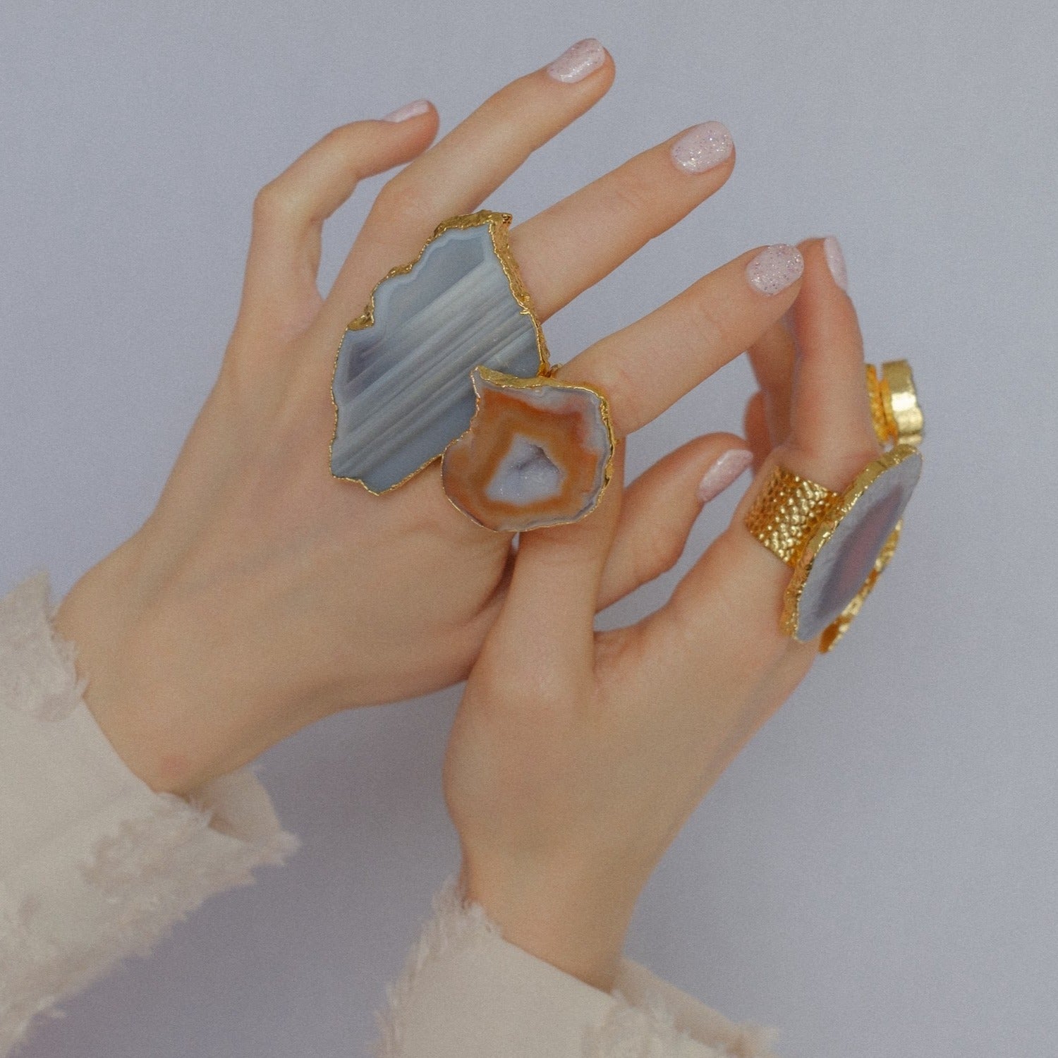 This ring is crafted from an 18k gold-plated brass base and features a handmade agate crystal gemstone. Each stone will vary slightly in size, shape, and color.