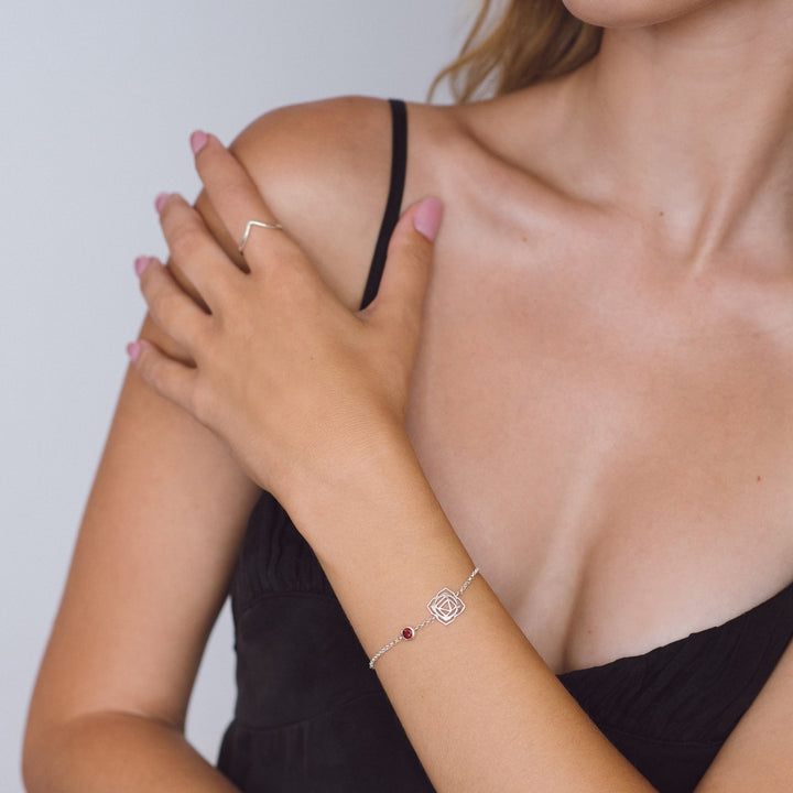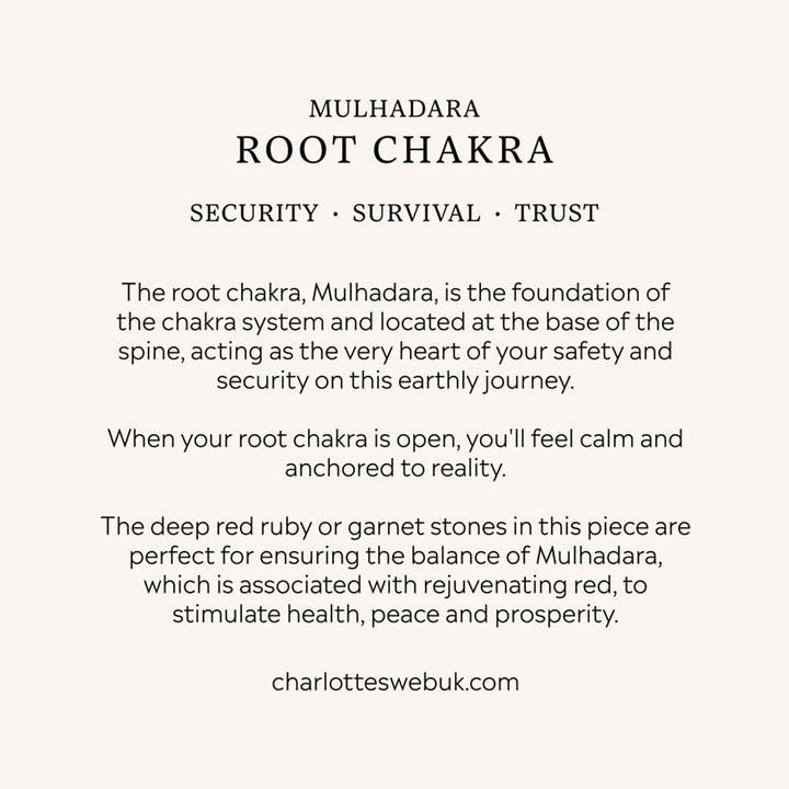 The Root Chakra Silver Bracelet by Charlotte's Web Jewellery is designed to guide you on your spiritual journey. This handcrafted bracelet balances the body and mind to instill confidence in the soul. It features a Muladhara chakra charm and a garnet gemstone on an adjustable sterling silver anchor link chain, helping to ground and reconnect you with the earth's energies.