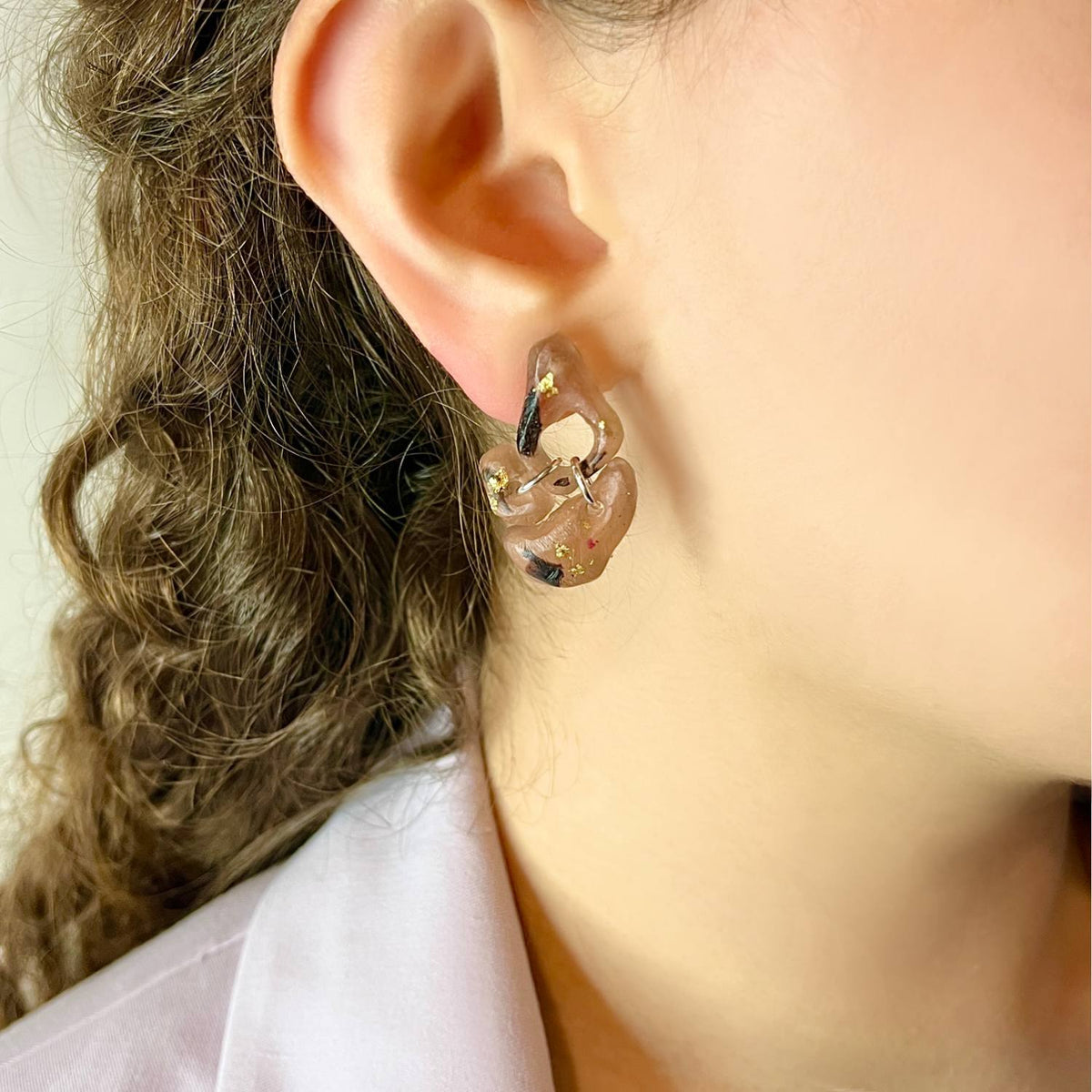 These Arber Earrings Mocha by Bio-Trimmings are eco-conscious artistry at its finest. Each short, statement stud is handcrafted from plant-based Bio-Gems in soft mocha tones, dusted with gold leaf for organic brilliance. Unique in shape, color, and texture, no two earrings are the same, making them wearable sculptures that combine sustainable innovation with elegant design.