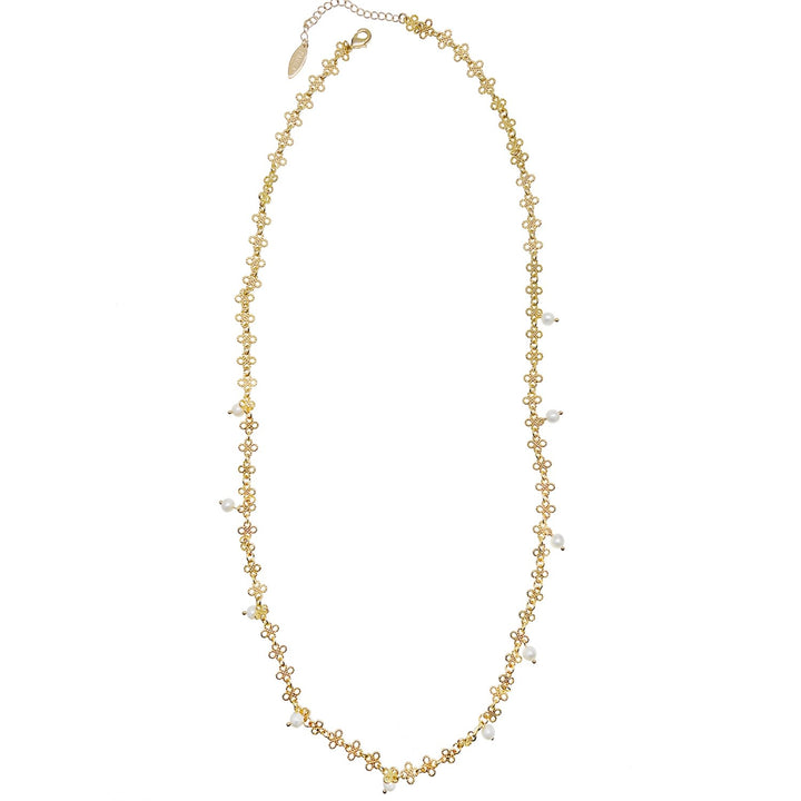This necklace features a delicate gold-plated chain and freshwater pearls. It has an adjustable length of 26 inches.
