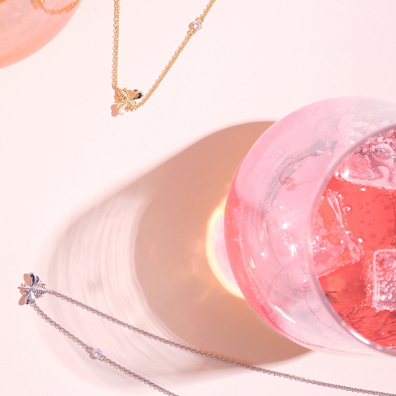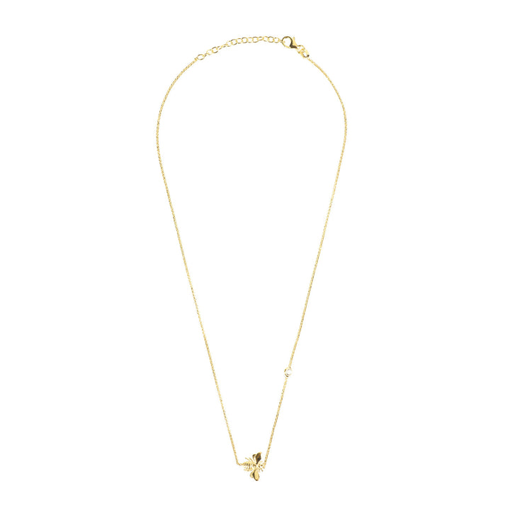 925 sterling silver dipped in 22ct gold. Cubic zirconia detailing. Bee pendant: 1cm x 1cm. Chain length: 38cm + 5cm adjuster.