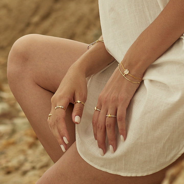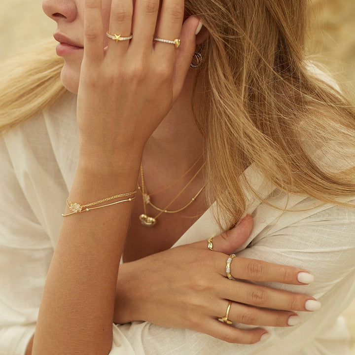 This Sterling Silver Clover Bracelet - Gold by Spero London is a chic and lucky accessory. Fashioned from 925 recycled sterling silver with a gold finish, this bracelet highlights a dainty white enamel four-leaf clover. The minimal chain and adjustable lobster claw lock ensure a comfortable, secure fit. This elegant piece is perfect for adding a beautiful, classic, and lucky touch to any outfit.