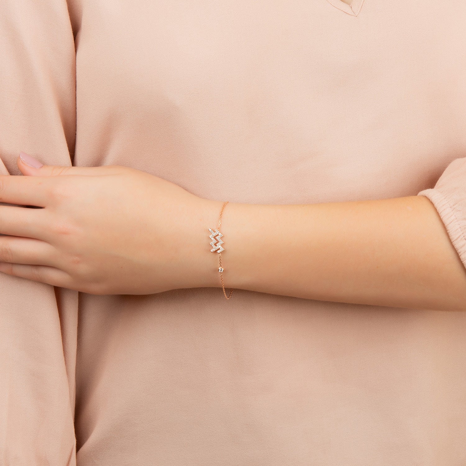 This Zodiac Horoscope Star Sign Bracelet Aquarius Gold by Latelita is a personalized and elegant accessory. It features multifaceted white zircons that are hand-set to represent the Aquarius star sign. This bracelet is a perfect way to celebrate your birthday and show off your personal style with a touch of celestial charm.