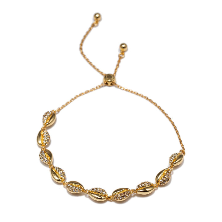 This Lucia Gold Shell Whisper Bracelet by Classicharms brings ocean-inspired elegance to the wrist. Tiny stylized shell charms adorned with pavé crystals shimmer like sunlight dancing on waves. With its adjustable bolo closure, it balances beauty and practicality, offering a graceful touch of coastal charm.