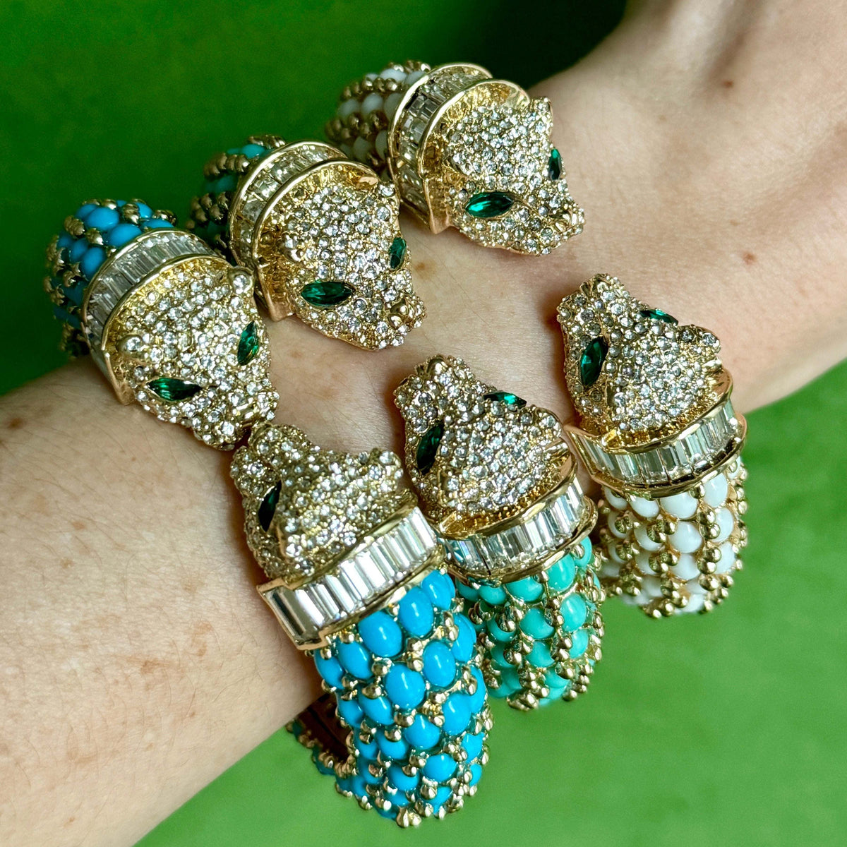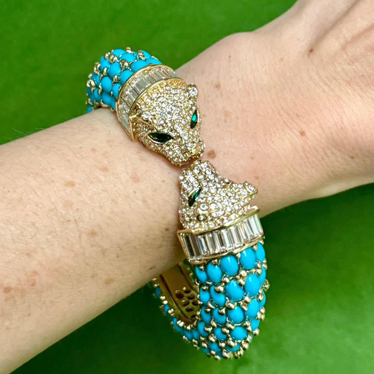 This Dark Blue Turquoise Double Headed Panther Bracelet by Laura Gray is a classic and chic accessory that adds a touch of fierce elegance to your collection. The modern panther design, adorned with crystal details and dark turquoise resin stones, combines bold energy with a sophisticated flair. It’s perfect for mixing and matching with your vintage gold bracelets.