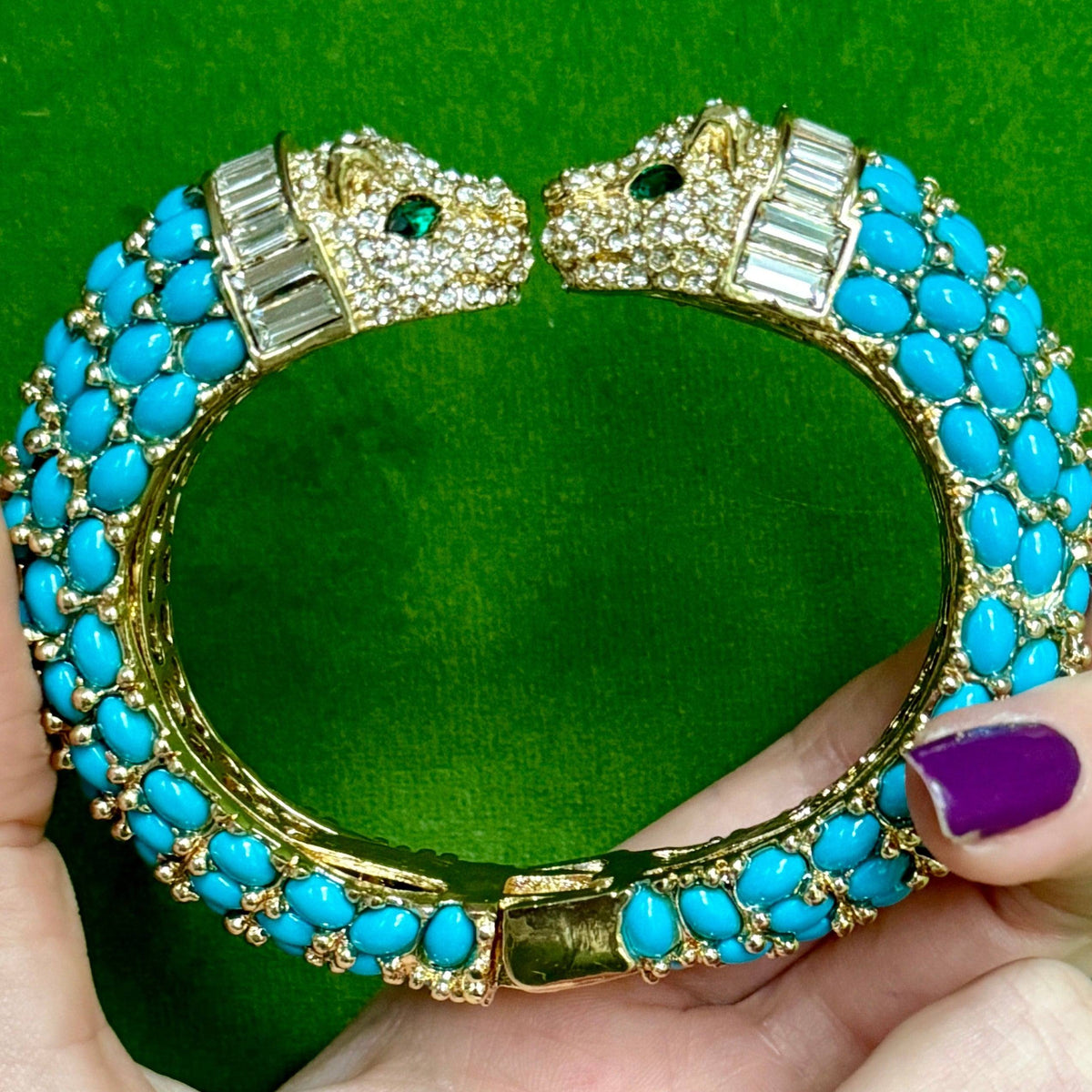 This bracelet is made of gold plate with crystal details and hand-set dark turquoise resin stones.