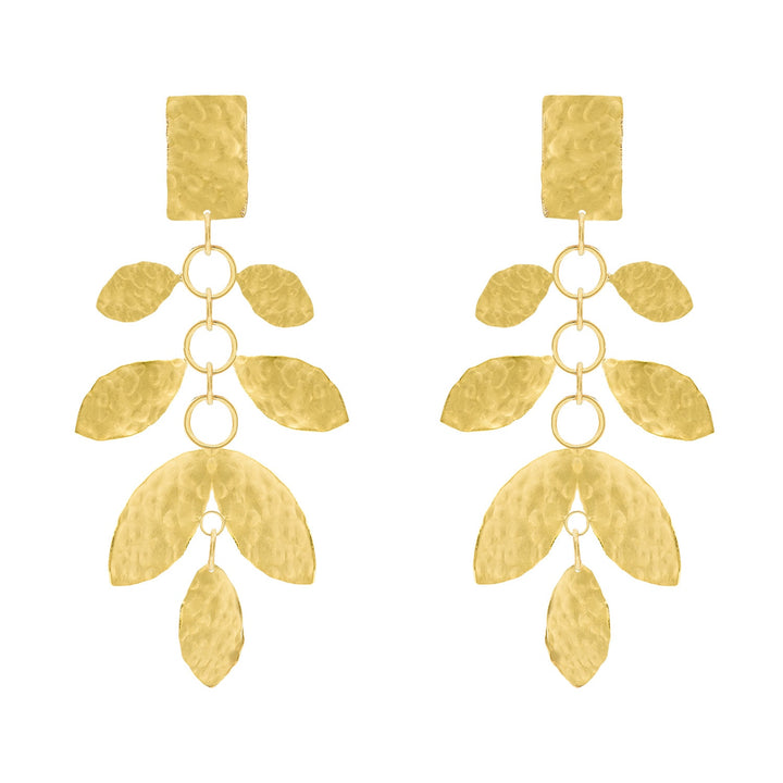 Handcrafted from 18k hammered gold plated metal, these earrings feature a leaf design attached to a chain. They measure 3" long and are made in Brazil.