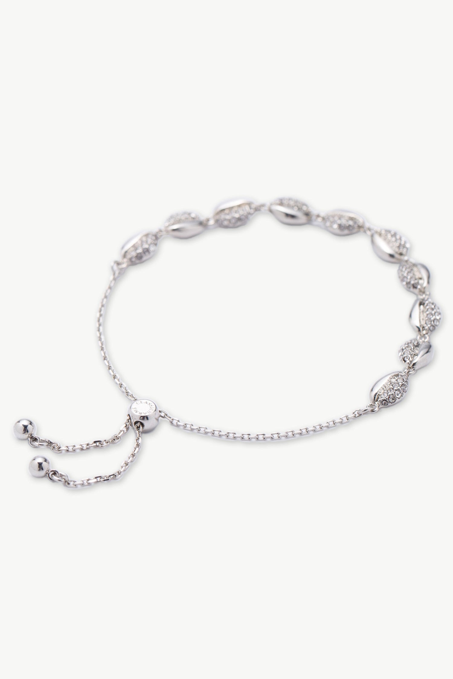 Rhodium-plated brass with high-polish finish. Adorned with Swarovski crystals. Adjustable modern bolo-style closure.