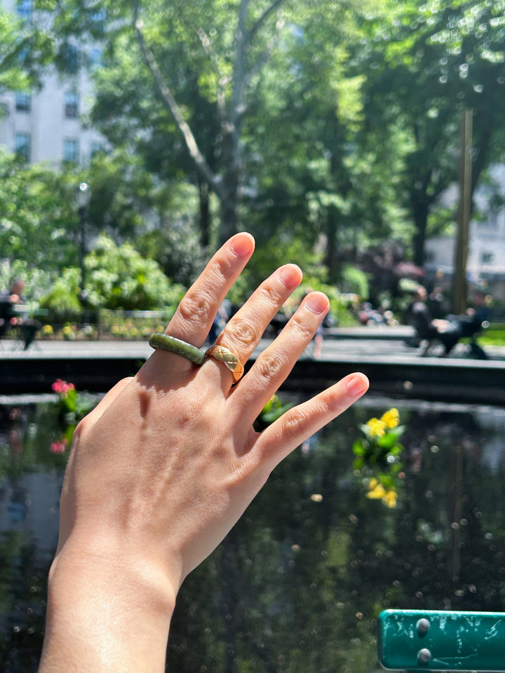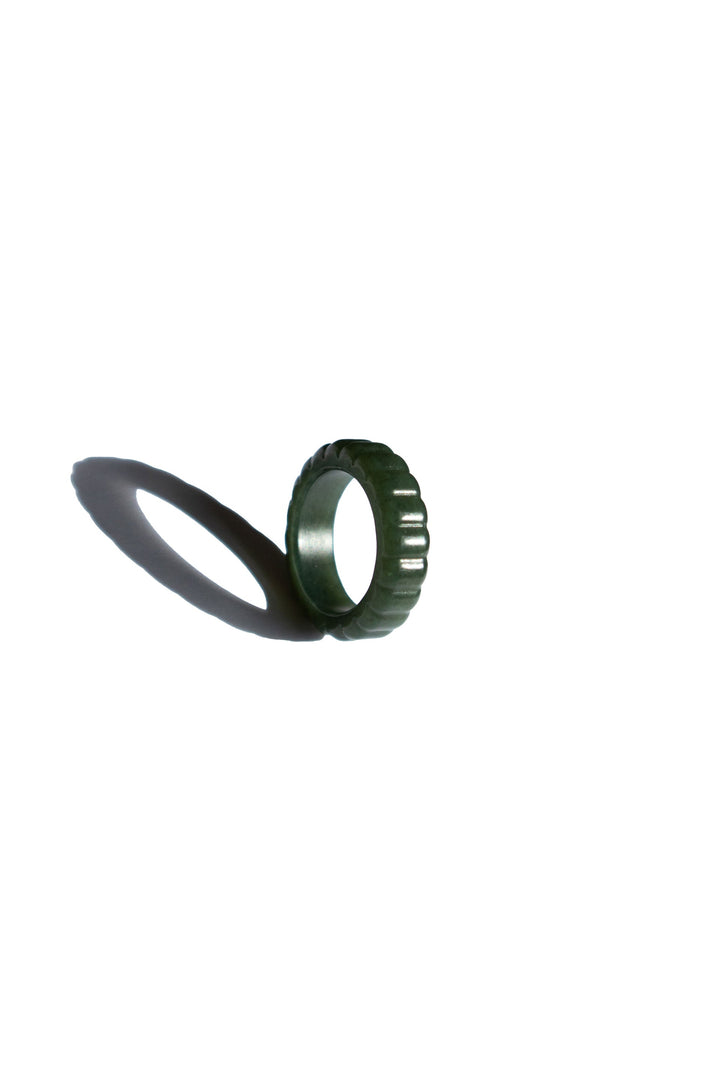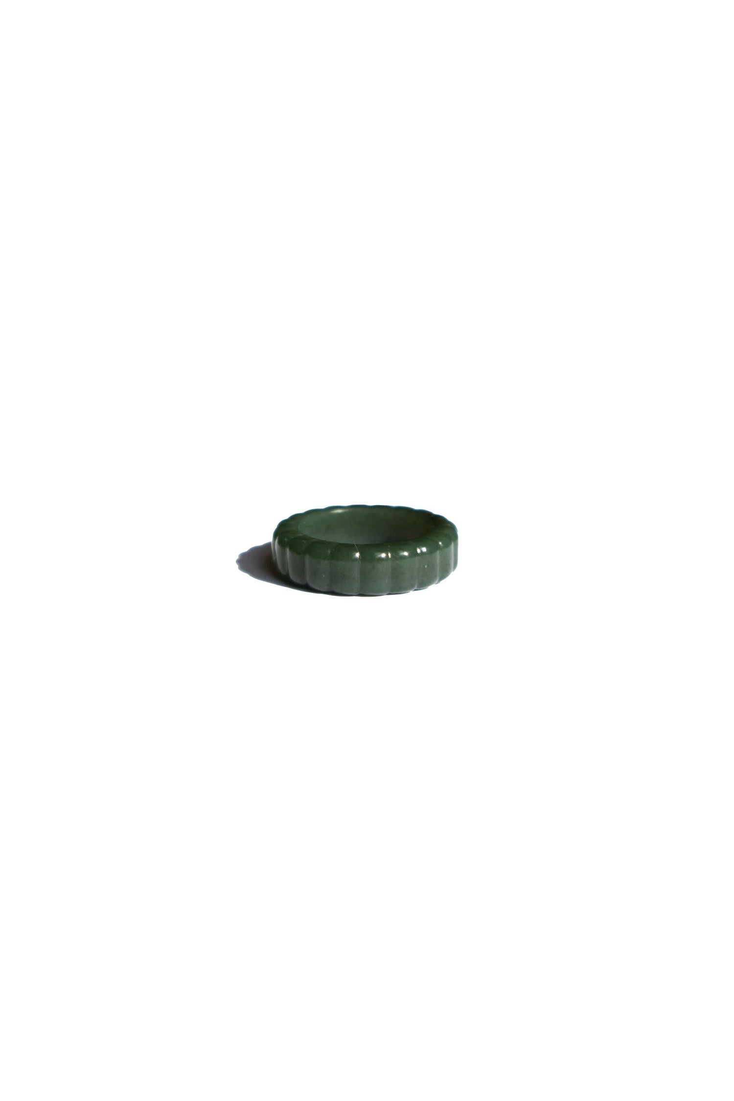 This Sophia Skinny Jade Ring by Seree is a perfect blend of subtle understatement and bold statement. The ring features a ribbed band crafted from dark green nephrite jade, a natural and untreated stone. Its sleek and stylish design makes a powerful fashion impact without being overly ostentatious. The unique textures and colors of each ring, due to the stone’s natural characteristics, add a personal touch. This piece is a sophisticated and confident accessory, perfect for someone who appreciates both minimalist style and natural beauty.