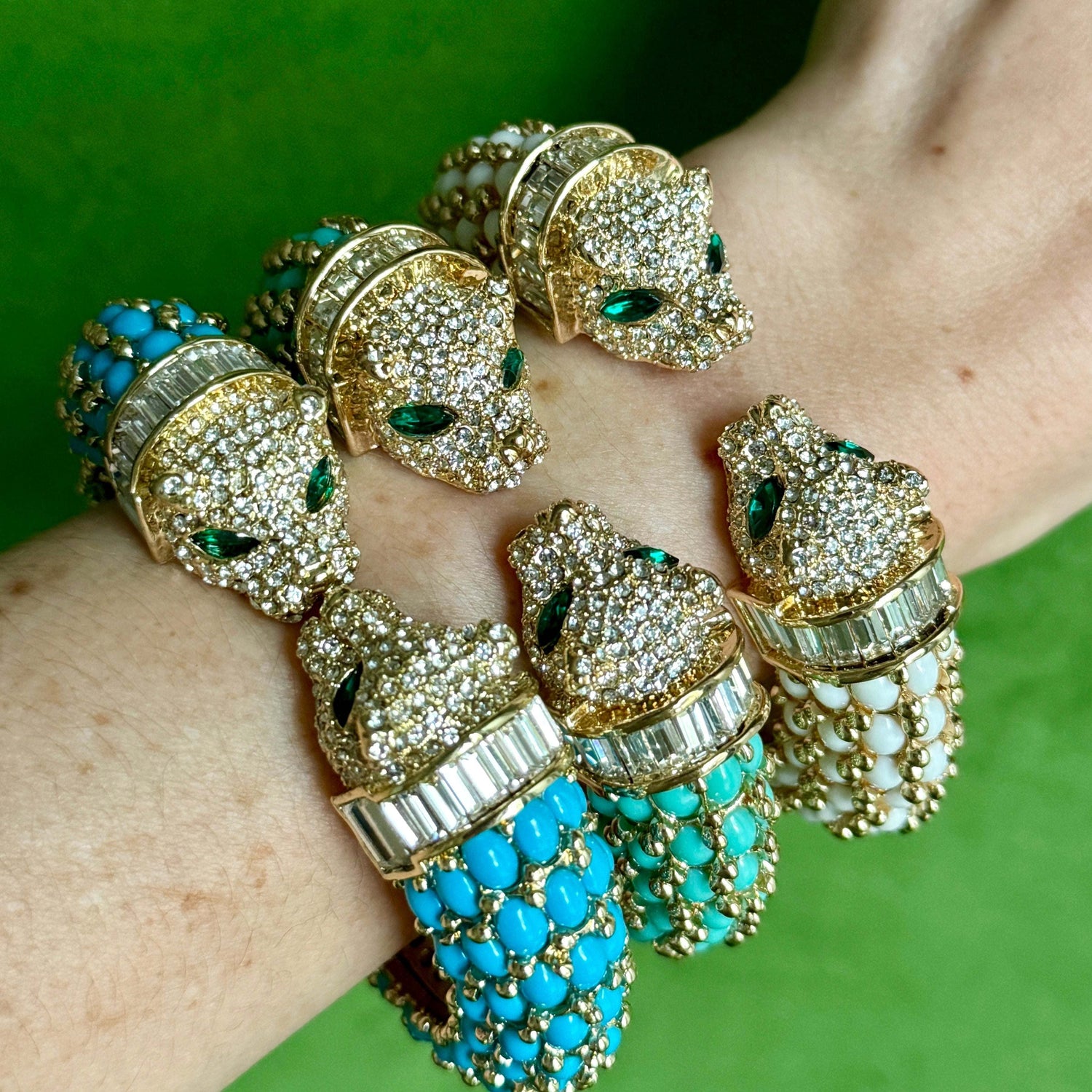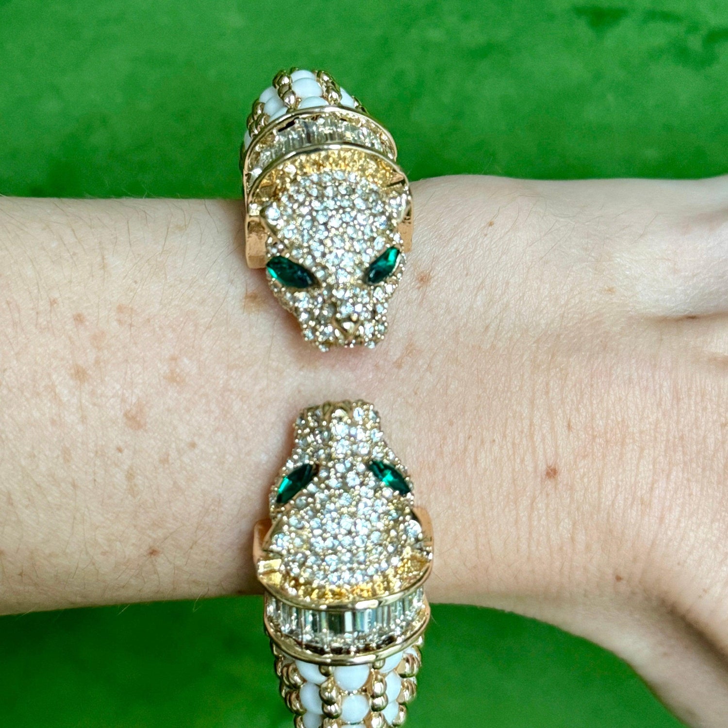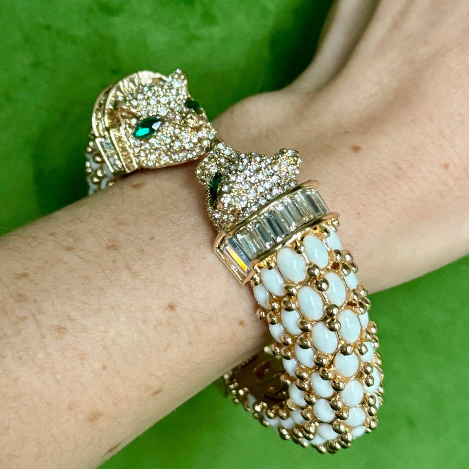 This White Double Panther Head Bracelet by Laura Gray is a classic and chic accessory that adds a touch of fierce elegance. The modern panther design, with crystal details and hand-set resin stones, offers a sophisticated and stylish flair. It is perfect for mixing and matching with your vintage gold bracelets for a curated look.