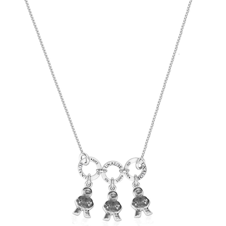 This Necklace With Three Baby Charms by Unaloe embodies love, joy, and personal storytelling. Each charm, with its hammered finish, symbolizes bonds and memories held close to the heart. A refined and deeply personal piece, it reflects both timeless design and the emotional essence of family.