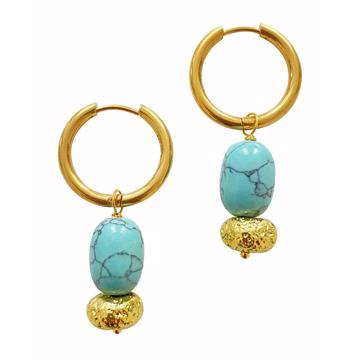 These earrings are crafted from gold-plated brass hoops and one-of-a-kind turquoise gemstones. The stone pendants are removable.
