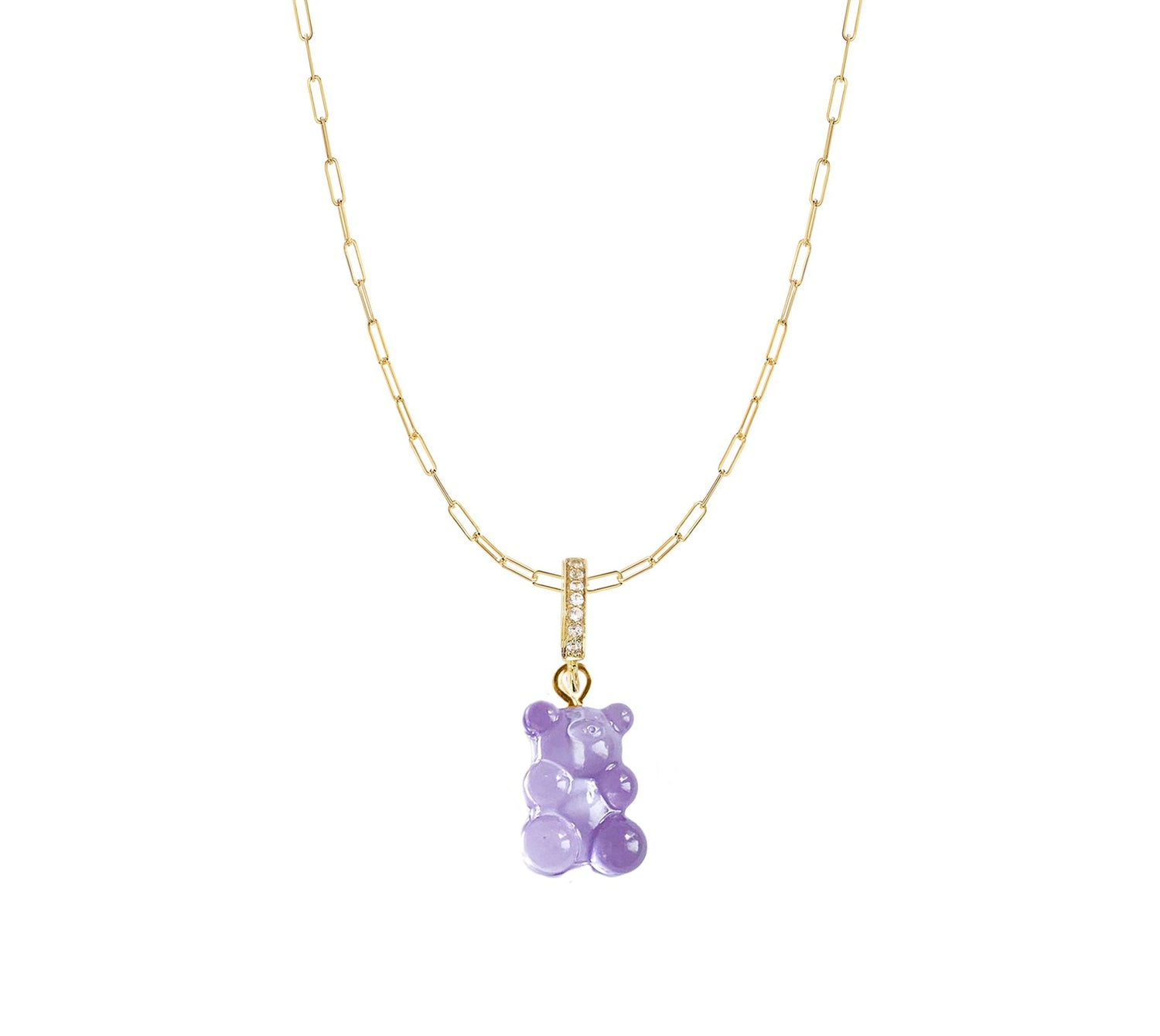 This Dainty Chain Gummy Necklace by Adriana Pappas Designs is a sweet and whimsical accessory. The adorable gummy bear charm, adorned with sparkling cubic zirconia crystals, hangs from a delicate gold-filled chain, creating a look that is both playful and chic. This necklace adds a touch of youthful charm and sparkle to your style.