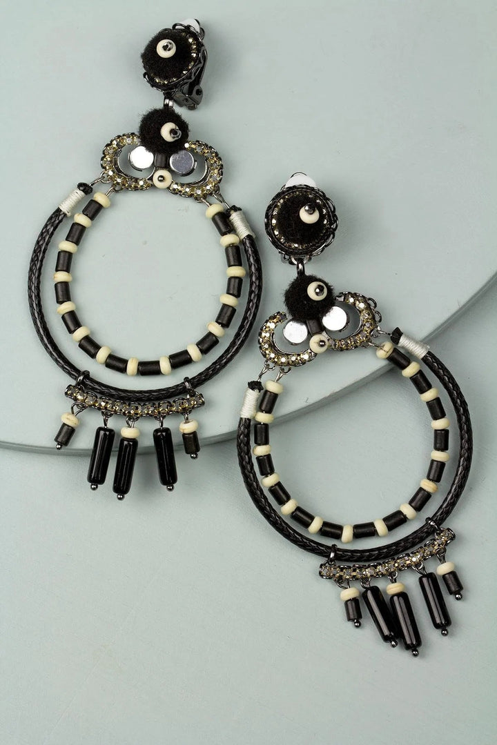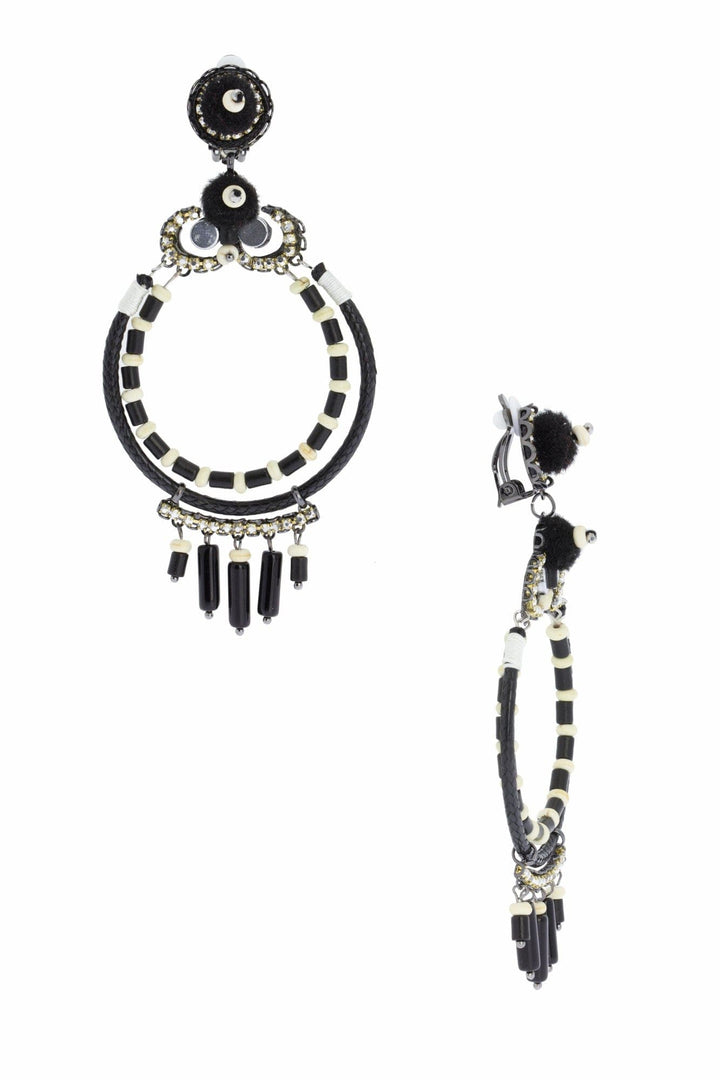 These statement earrings feature a braided hoop shape with stones, crystals, and pom-poms. They have a clip-on backing and measure 3.5 inches by 1.5 inches.