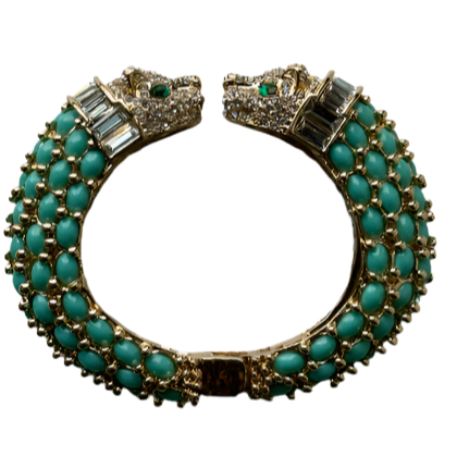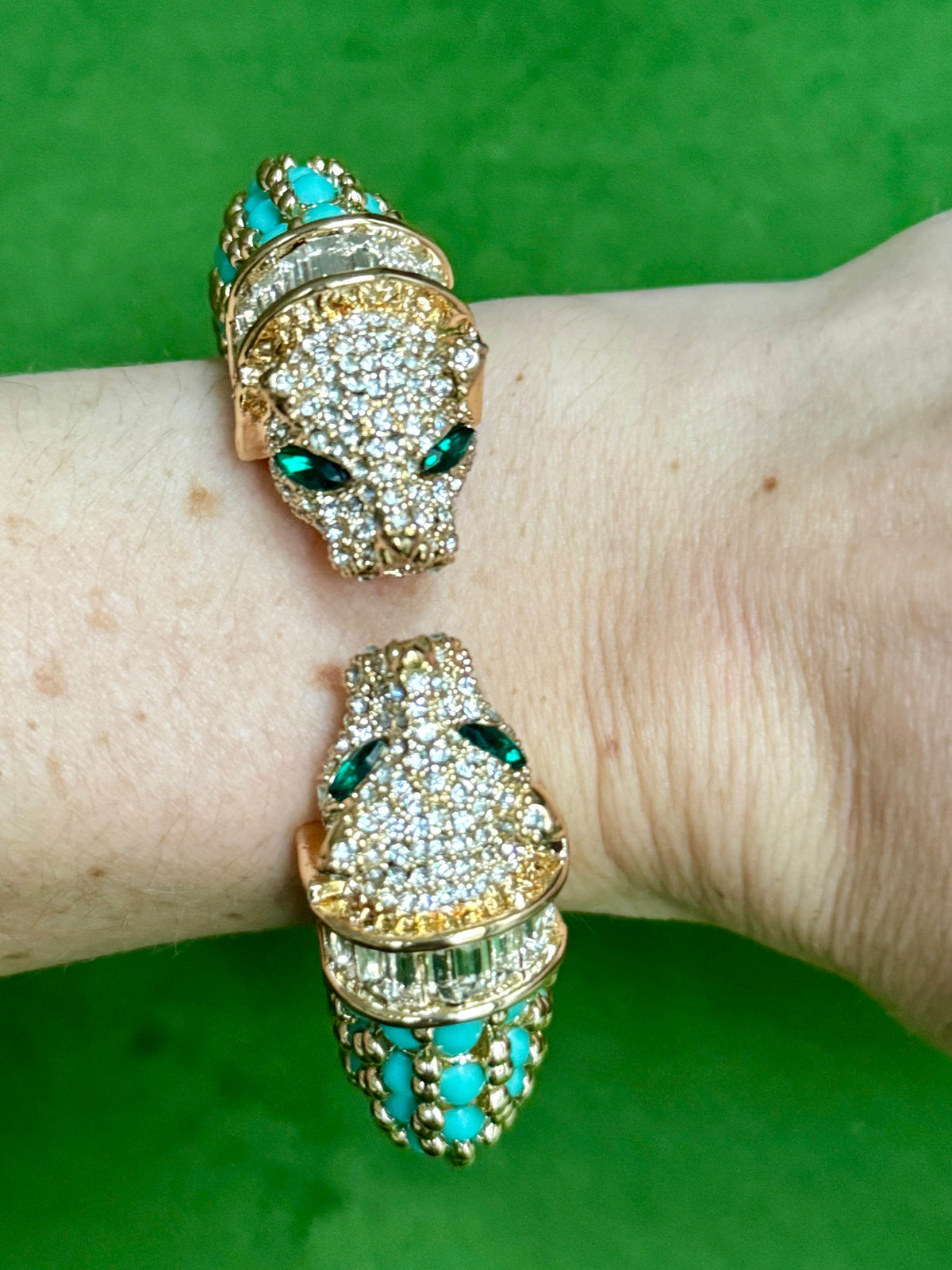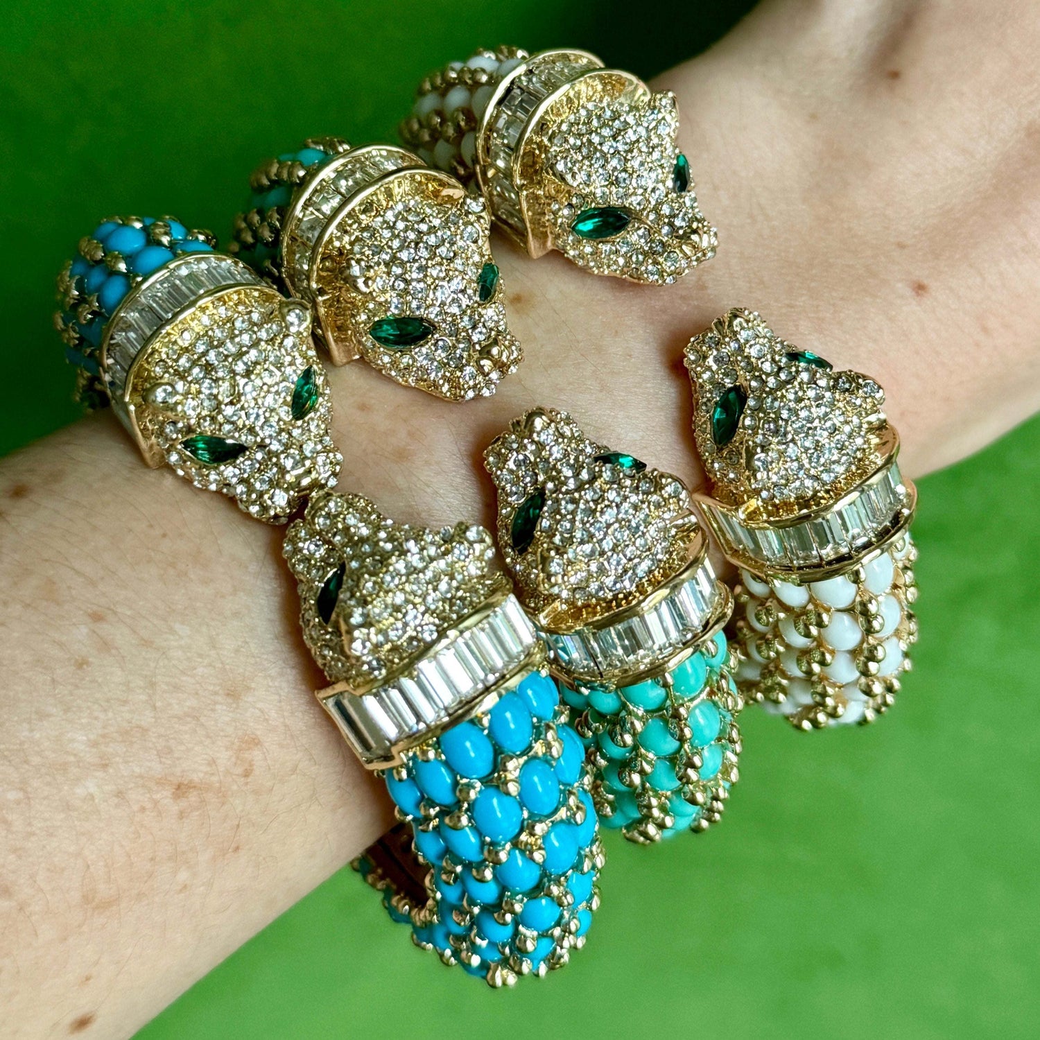 Our Light Blue Turquoise Double Panther Bracelet by Laura Gray is a classic and chic accessory that adds a touch of fierce elegance to your collection. The modern panther design, adorned with crystal details and turquoise resin stones, combines bold animalistic energy with a sophisticated flair. It’s perfect for mixing and matching with your other vintage gold bracelets.