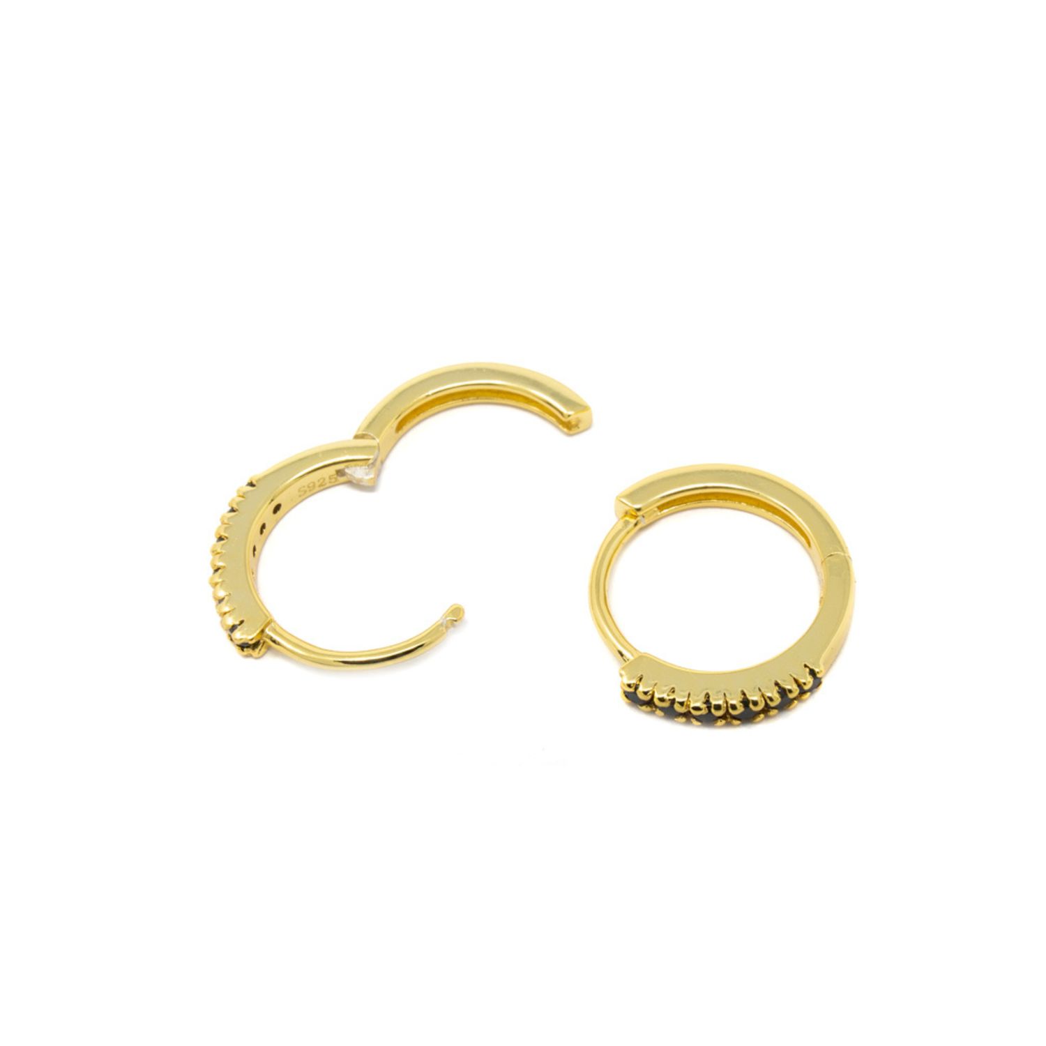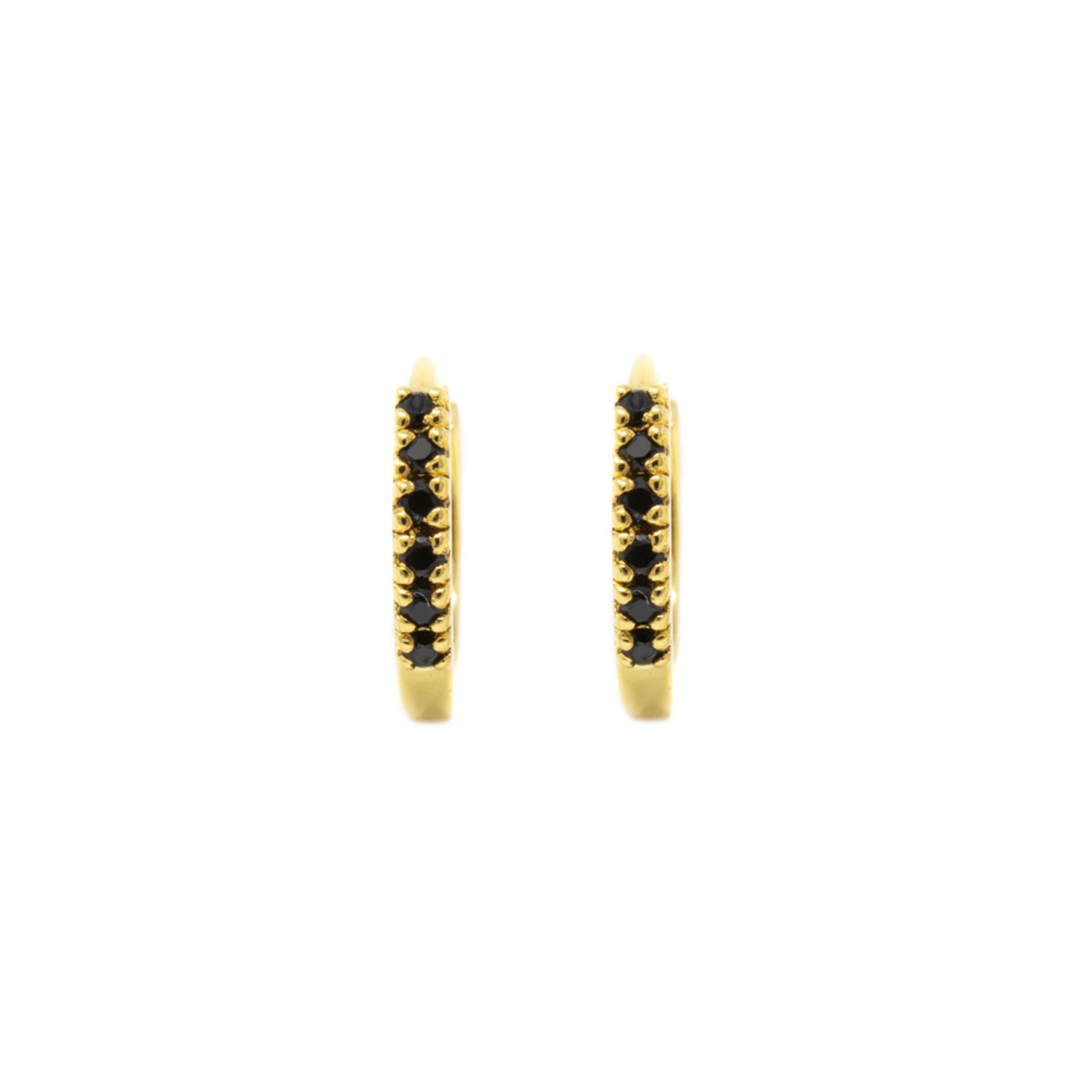 Cast in 925 solid sterling silver with 18k yellow gold vermeil. Set with black spinel gemstones. Huggie hoop design.