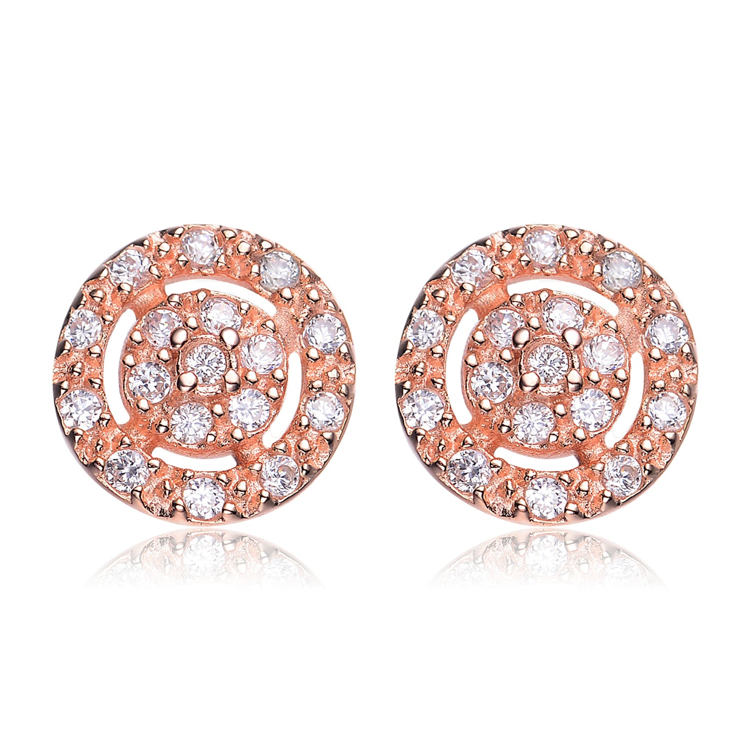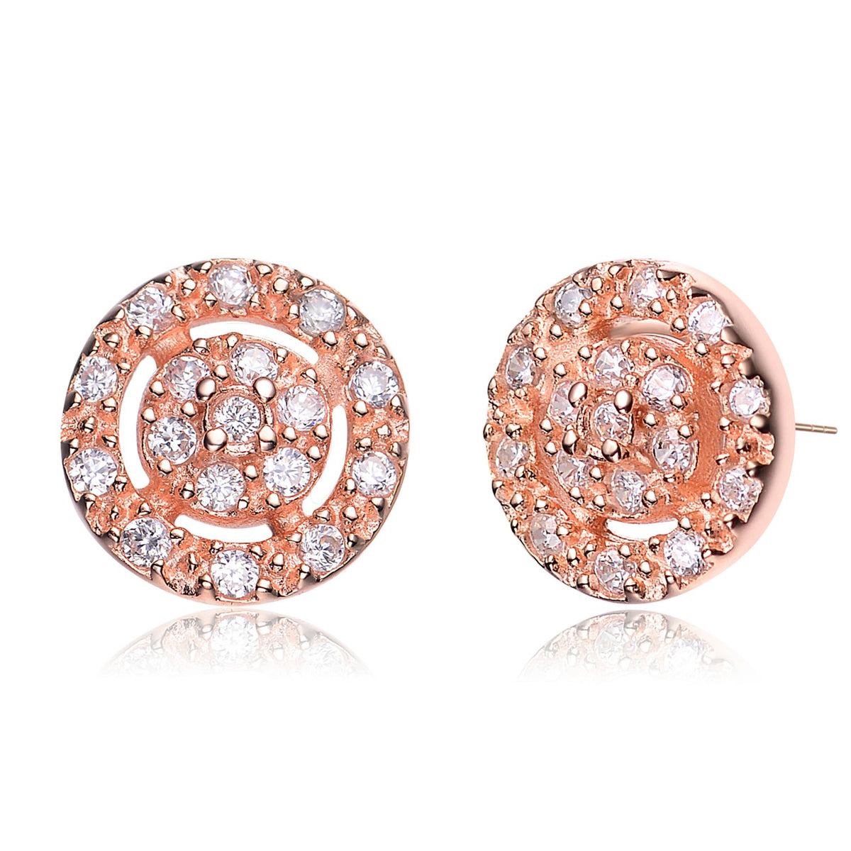 These round stud earrings are crafted from .925 sterling silver with rose plating. They feature clear, round-cut cubic zirconia stones and secure with butterfly clasps.