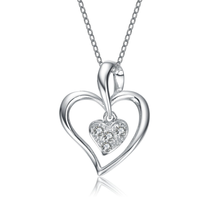 This necklace is crafted from .925 sterling silver with white gold plating. The double heart pendant is decorated with white round-cut cubic zirconia stones. It secures with a spring-ring clasp.