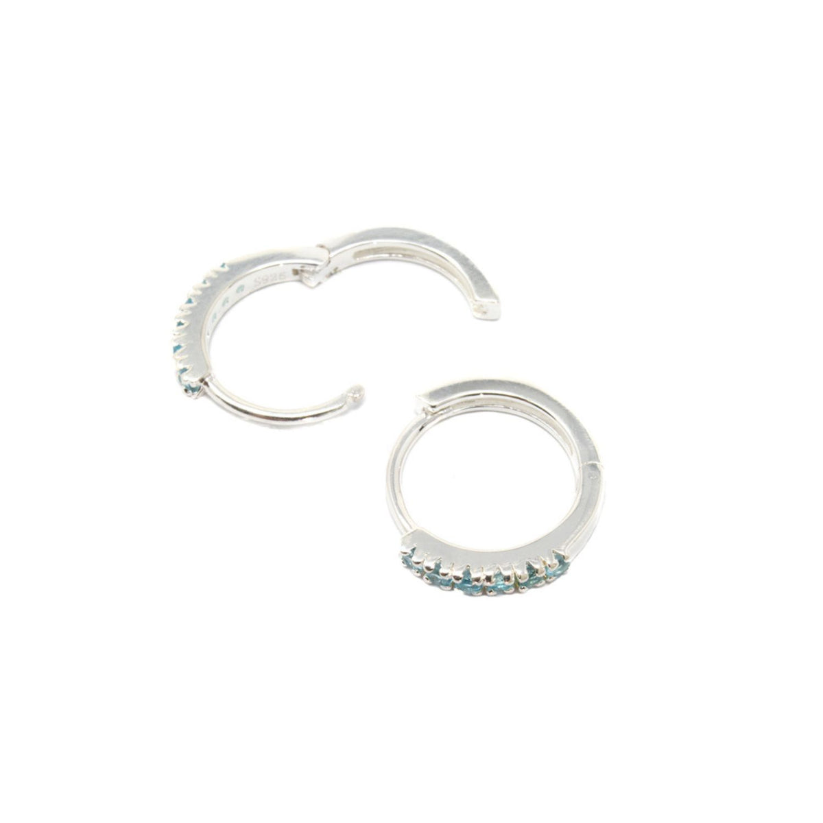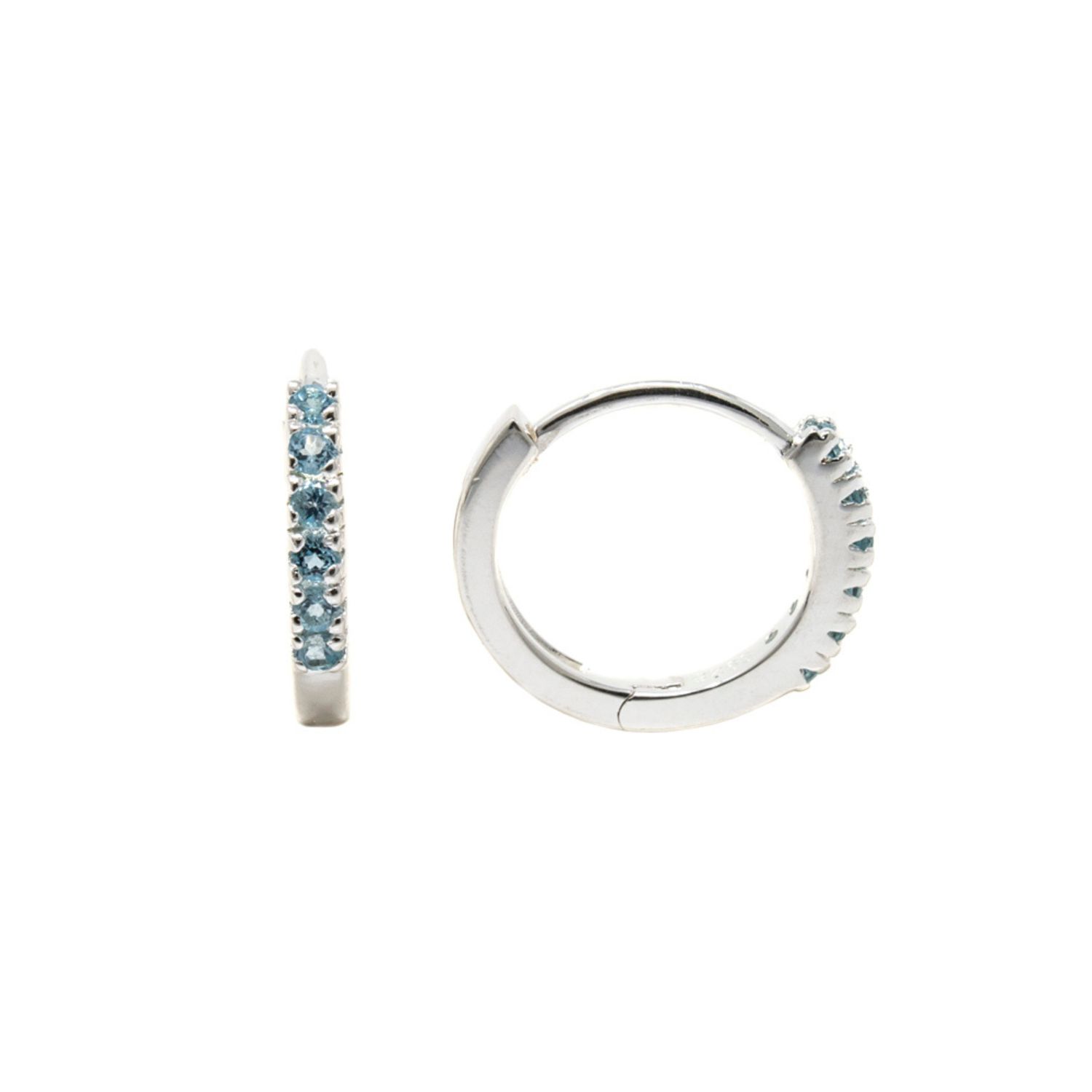 Cast in 925 solid sterling silver, set with natural blue topaz gemstones. Secure huggie hoop closure. Handcrafted finish.