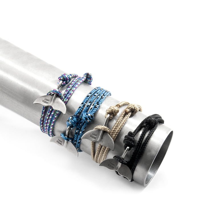 This bracelet is made from recycled Marine Grade polyester and nylon rope with a solid .925 sterling silver big whale fin tail. It is 100% recycled plastic and precious metals.
