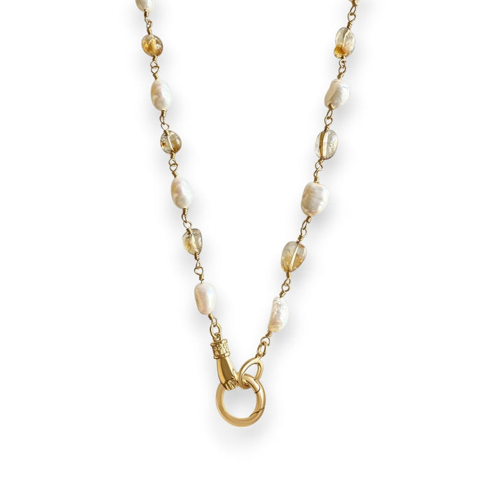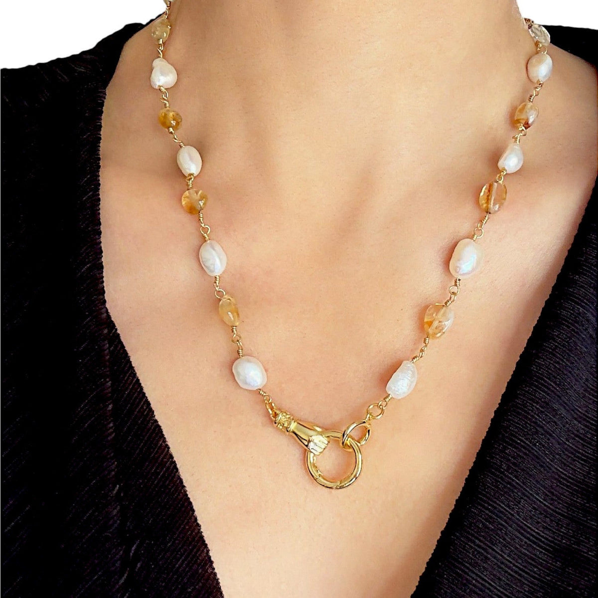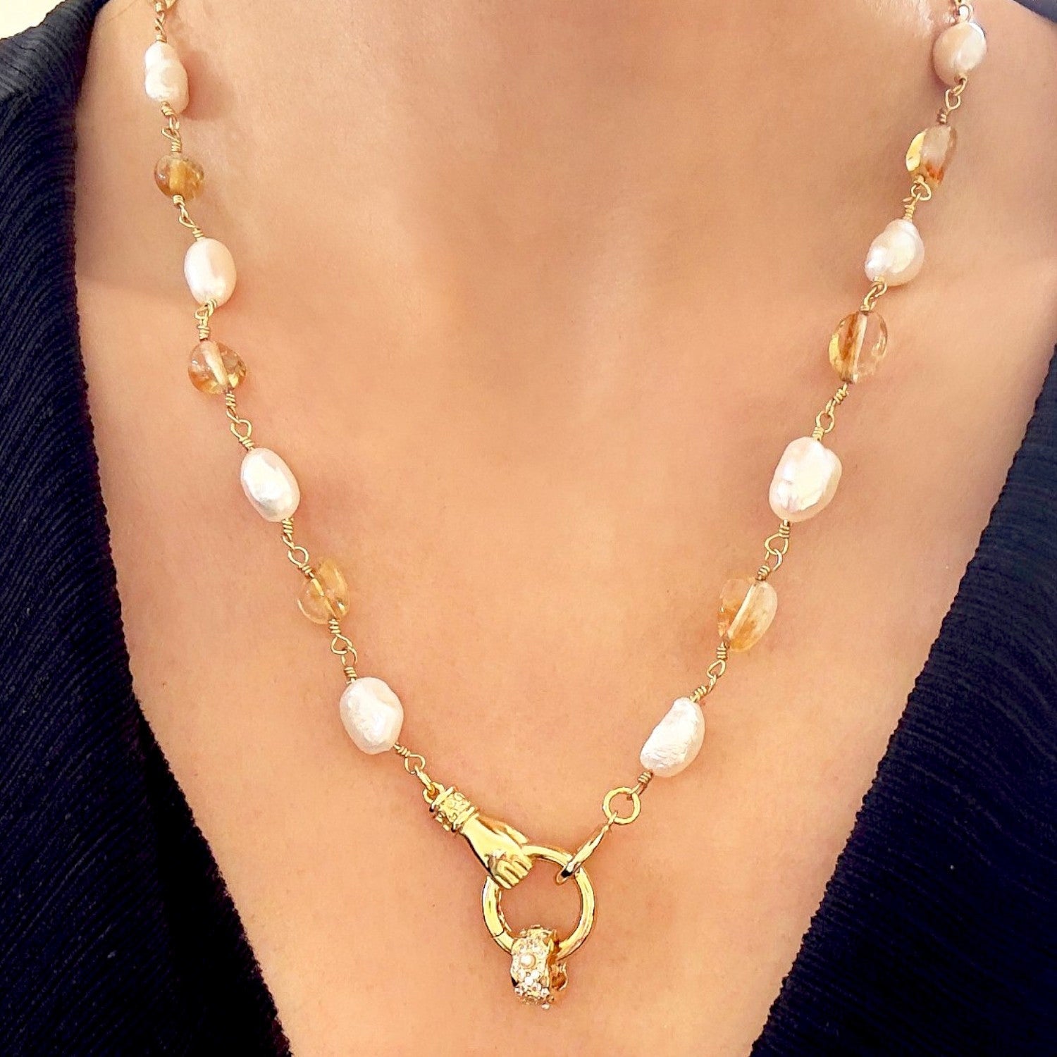 This necklace is made with golden citrine and freshwater pearls. The clasps and hand charms are gold. It has a push-clasp closure.
