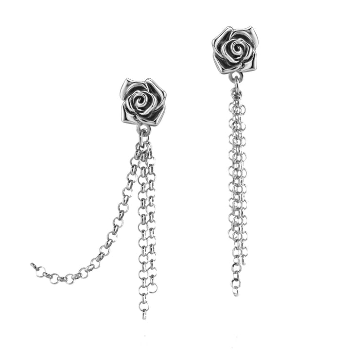 Shine Asymmetric Rose Drop Earrings In Sterling Silver – Floral Chain Jewelry – Earrings For Women