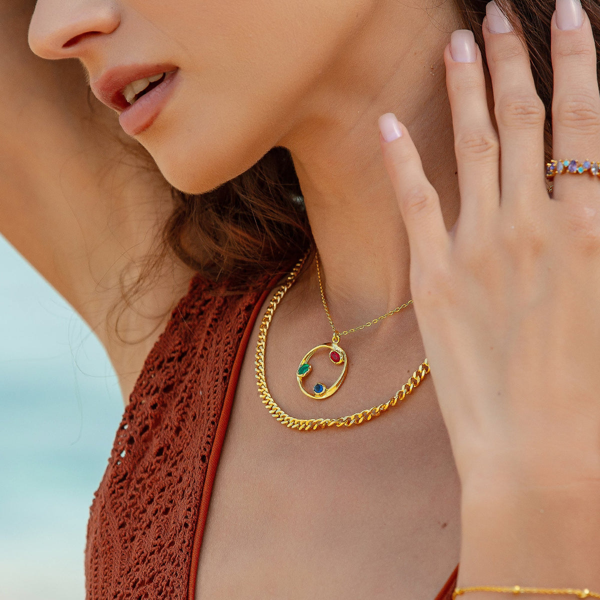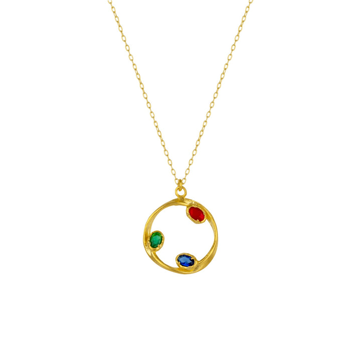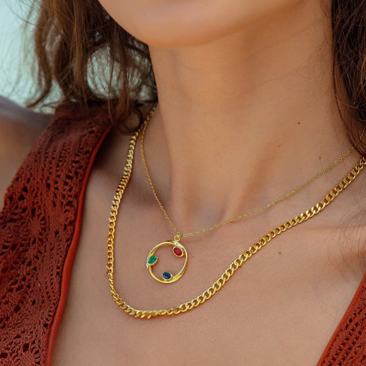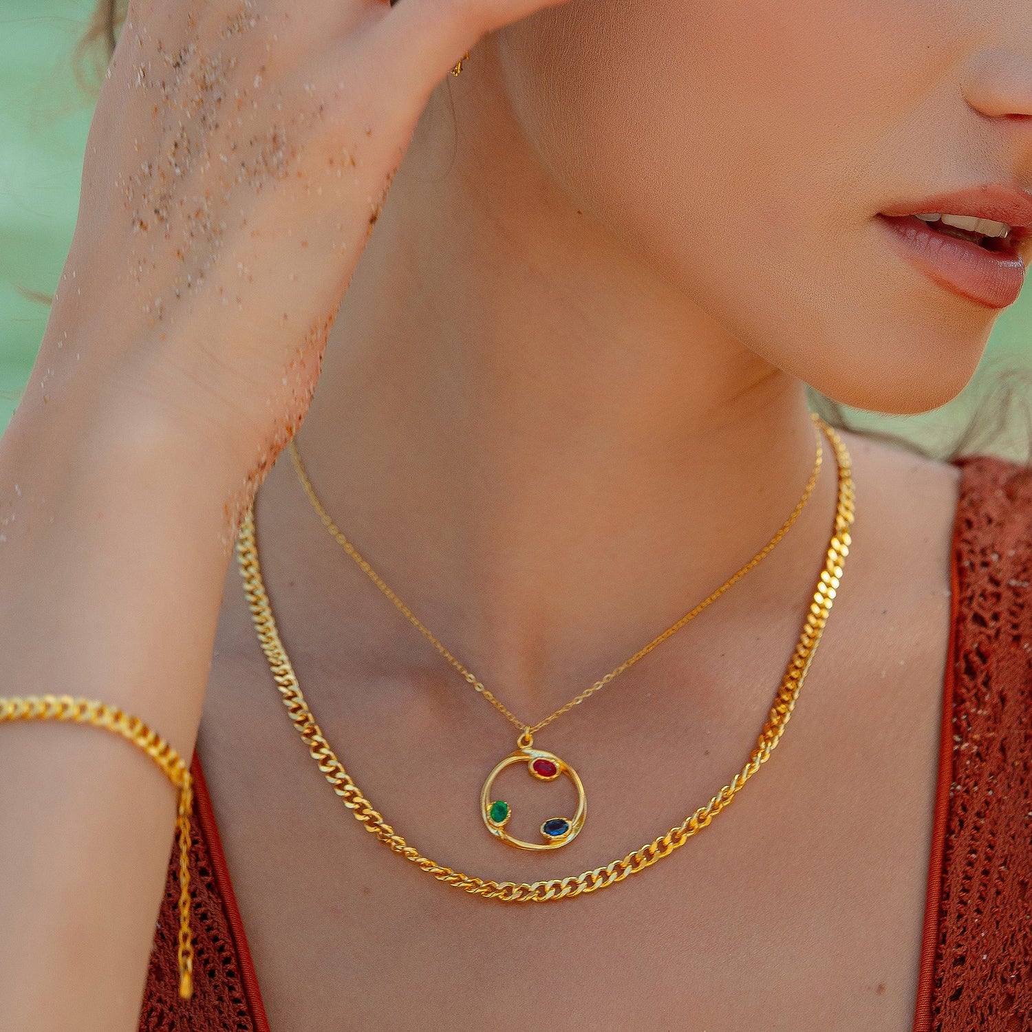 This Tri-Gem Harmony Gold Pendant Necklace by Mejoma is an elegant and eye-catching accessory. The three sparkling gems, beautifully arranged on a gold chain, create a sophisticated and harmonious look. This necklace is the perfect finishing touch for any outfit, offering a confident and stylish statement.