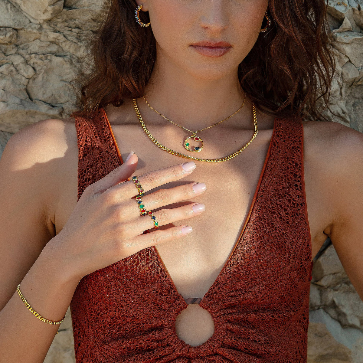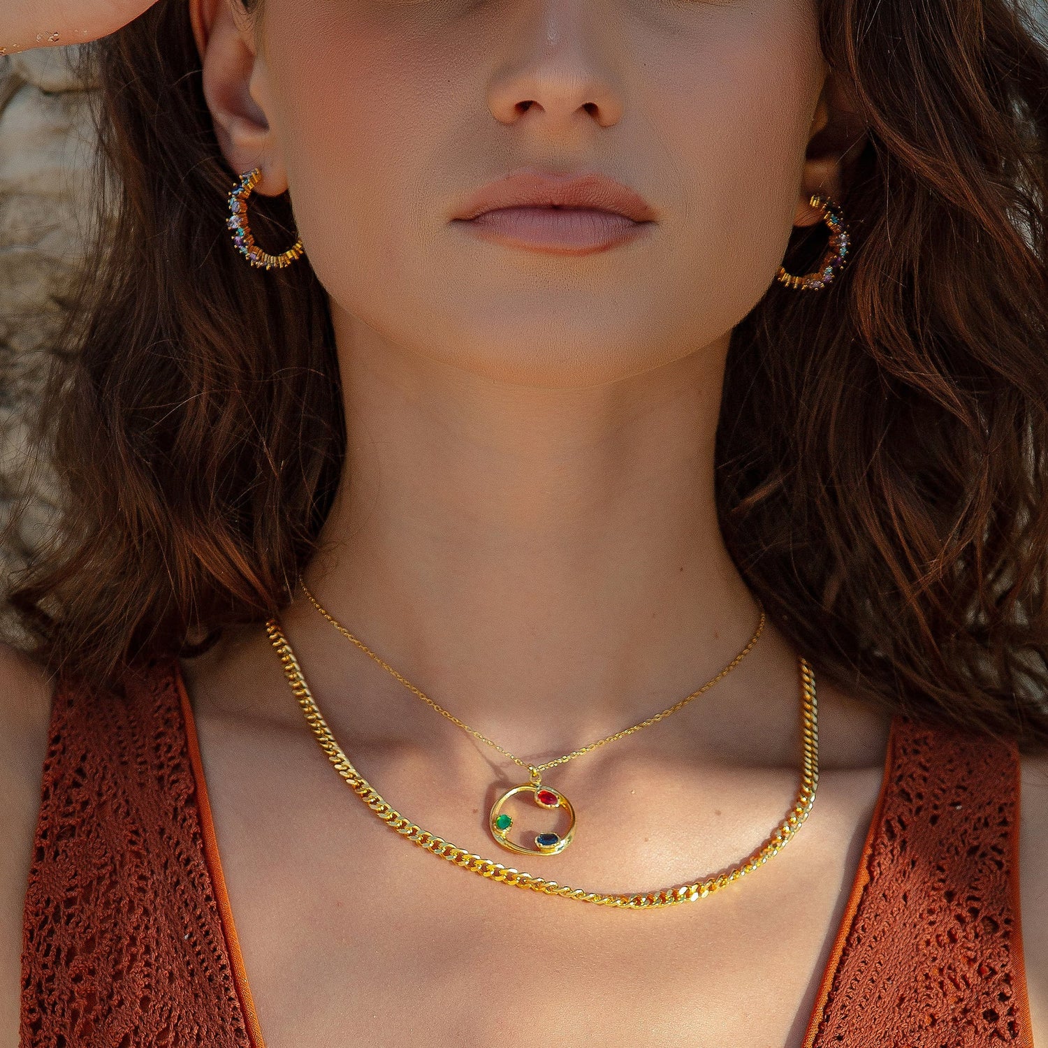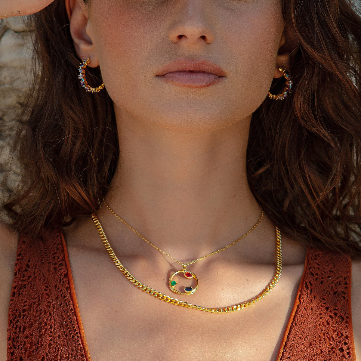 This Tri-Gem Harmony Gold Pendant Necklace by Mejoma is an elegant and eye-catching accessory. The three sparkling gems, beautifully arranged on a gold chain, create a sophisticated and harmonious look. This necklace is the perfect finishing touch for any outfit, offering a confident and stylish statement.