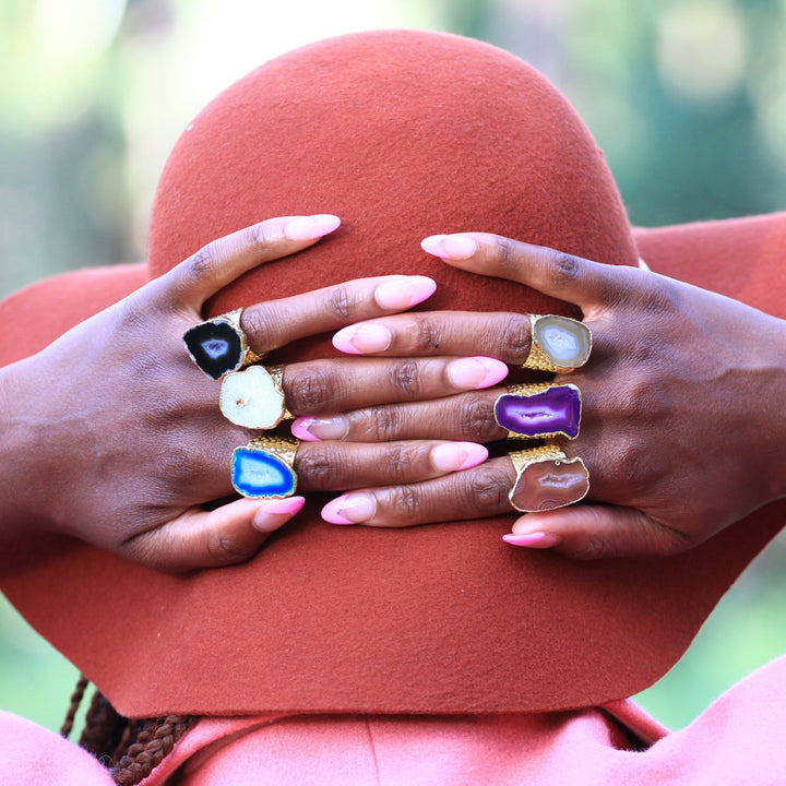 This ring is handmade with an 18K gold-plated brass band and features a unique agate crystal gemstone. The stone shapes and sizes vary from ring to ring.