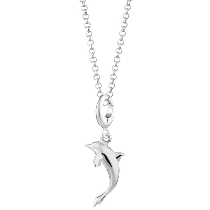 This Sterling Silver Dolphin Charm Necklace by Lily Charmed is an elegant accessory. It features a smooth, graceful dolphin charm that captures the magic of the ocean. The charm is made from recycled silver and is compatible with other leading charm jewelry brands. It is presented in a beautiful gift box, making it perfect for sea lovers of all ages.