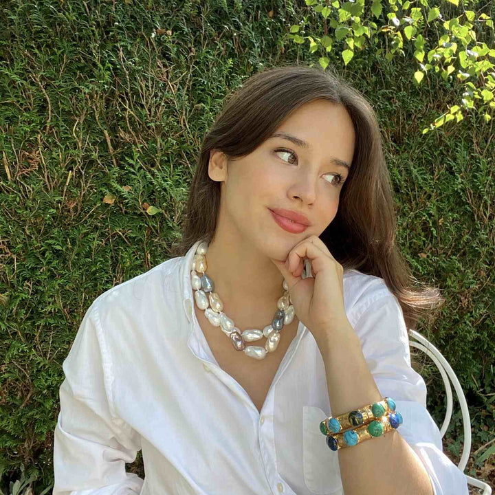 This Antique Gold Stretch Bracelet by Michael Nash Jewelry is a striking statement piece that effortlessly blends a vintage aesthetic with modern style. The stretch design ensures a comfortable fit for most wrists, while the beautiful malachite, lapis, and turquoise resin stones create a captivating array of blues and greens. Its bold presence and versatile color palette make it a must-have for adding a touch of impact and sophistication to any look.