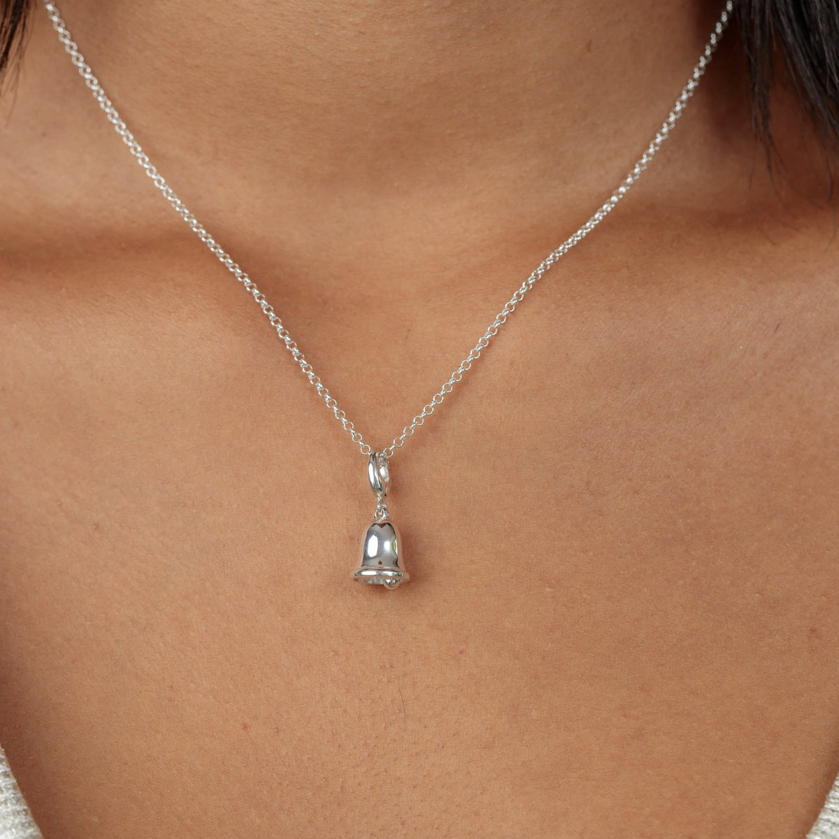 The Sterling Silver Bell Charm Necklace is a super sweet and fashionable accessory. The silver bell charm is compatible with all other leading charm jewelry brands and attaches with a clip-on clasp. It is made from recycled 925 sterling silver with rhodium plating on the charm.