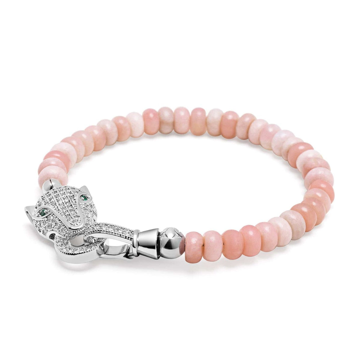 This bracelet is made with natural pink opal beads and a panther head centerpiece crafted from high-polish, silver-tone stainless steel with clear cubic zirconia stones.