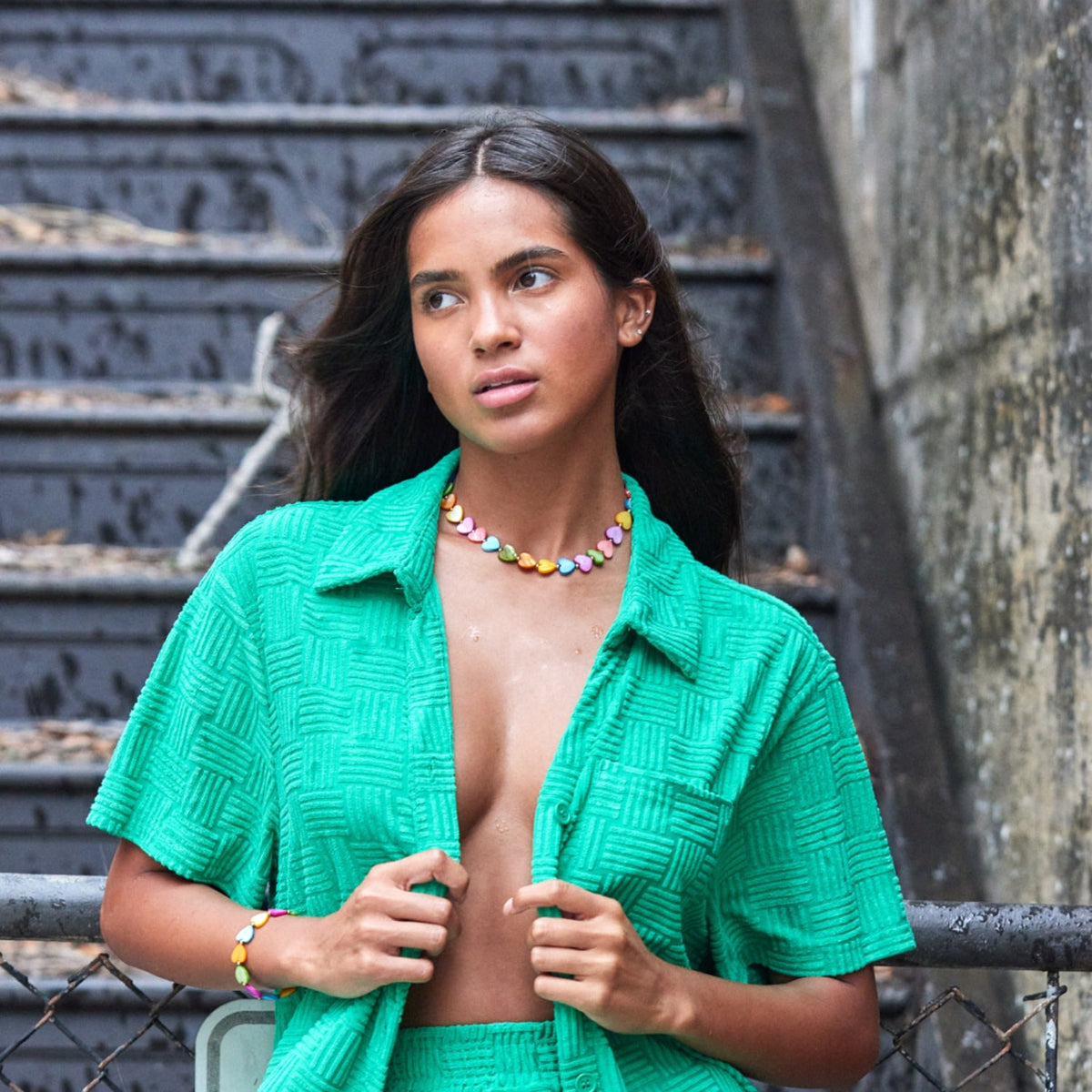 This Rainbow Hearts Choker by Adriana Pappas Designs is a bright and bold accessory. The mother of pearl heart beads in a rainbow pattern create a fun and whimsical look. This handmade choker is adjustable, making it a comfortable and personal piece for adding a touch of playful style to your outfit.