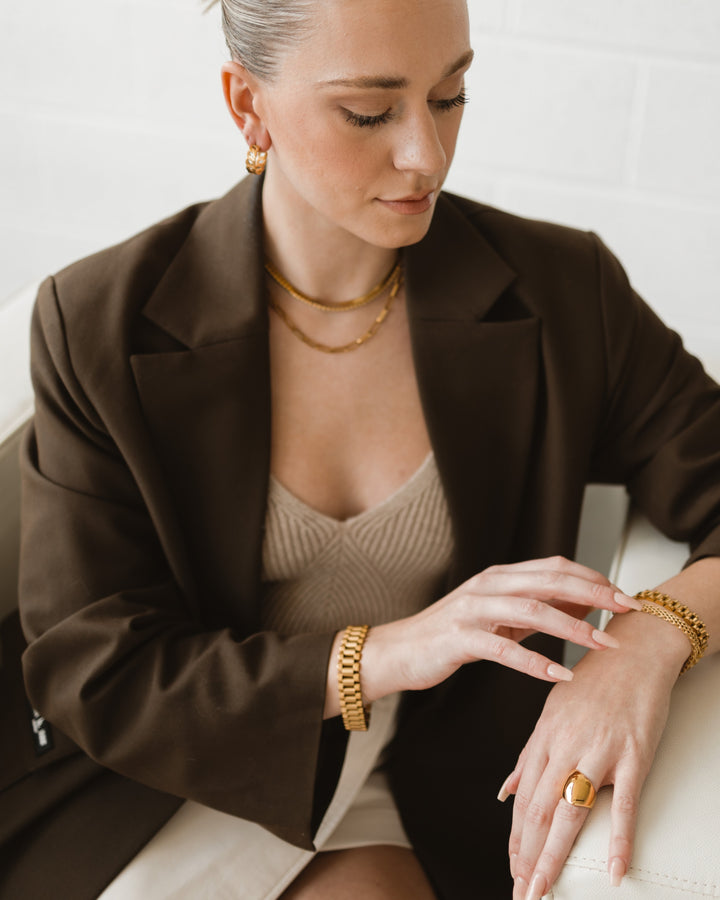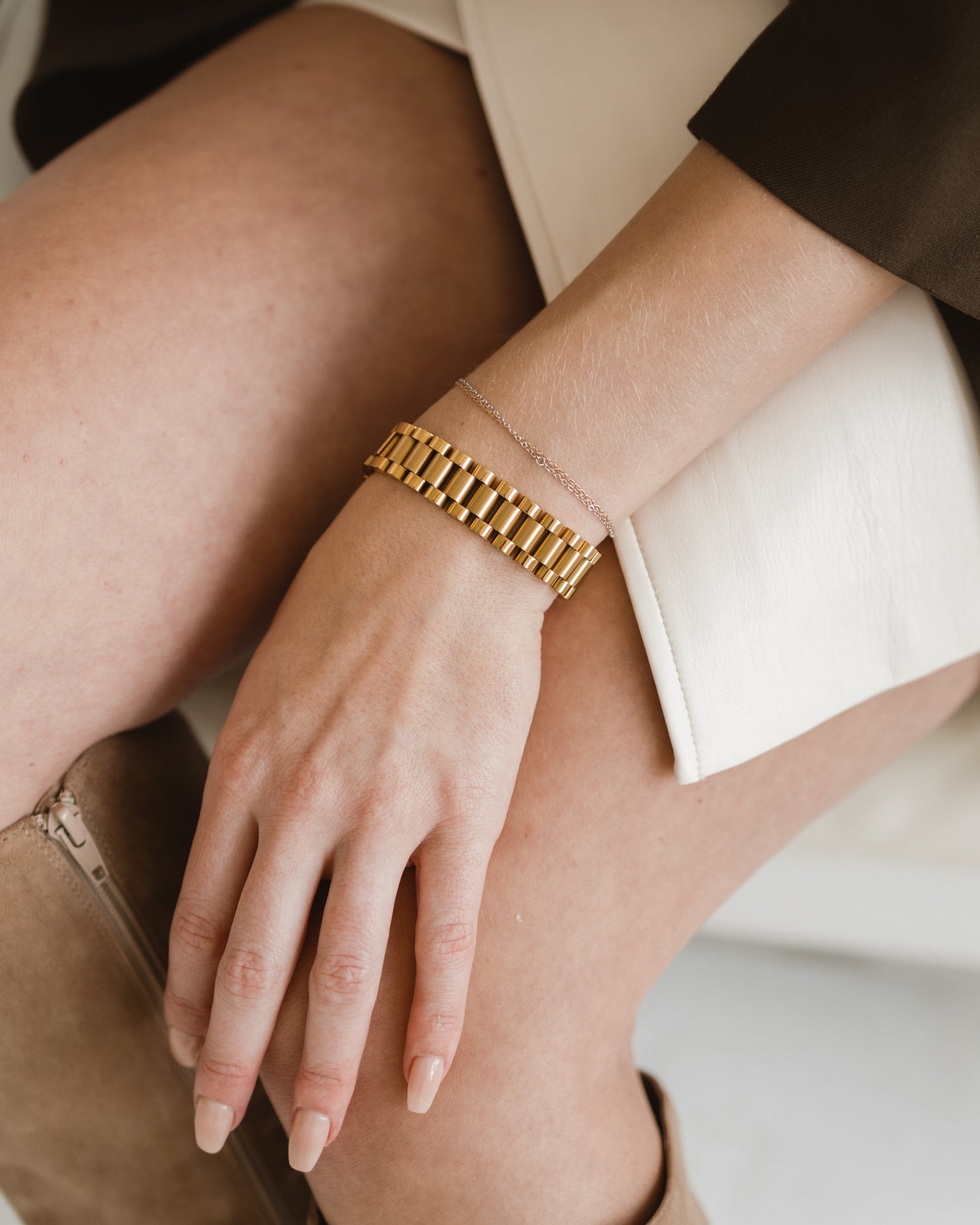 This bracelet is crafted from high-quality stainless steel coated with 18k gold. It features a watch link design with polished ion plating on the front and brushed ion plating on the back, and is secured with a folding clasp. It is also hypoallergenic, waterproof, and non-tarnish.