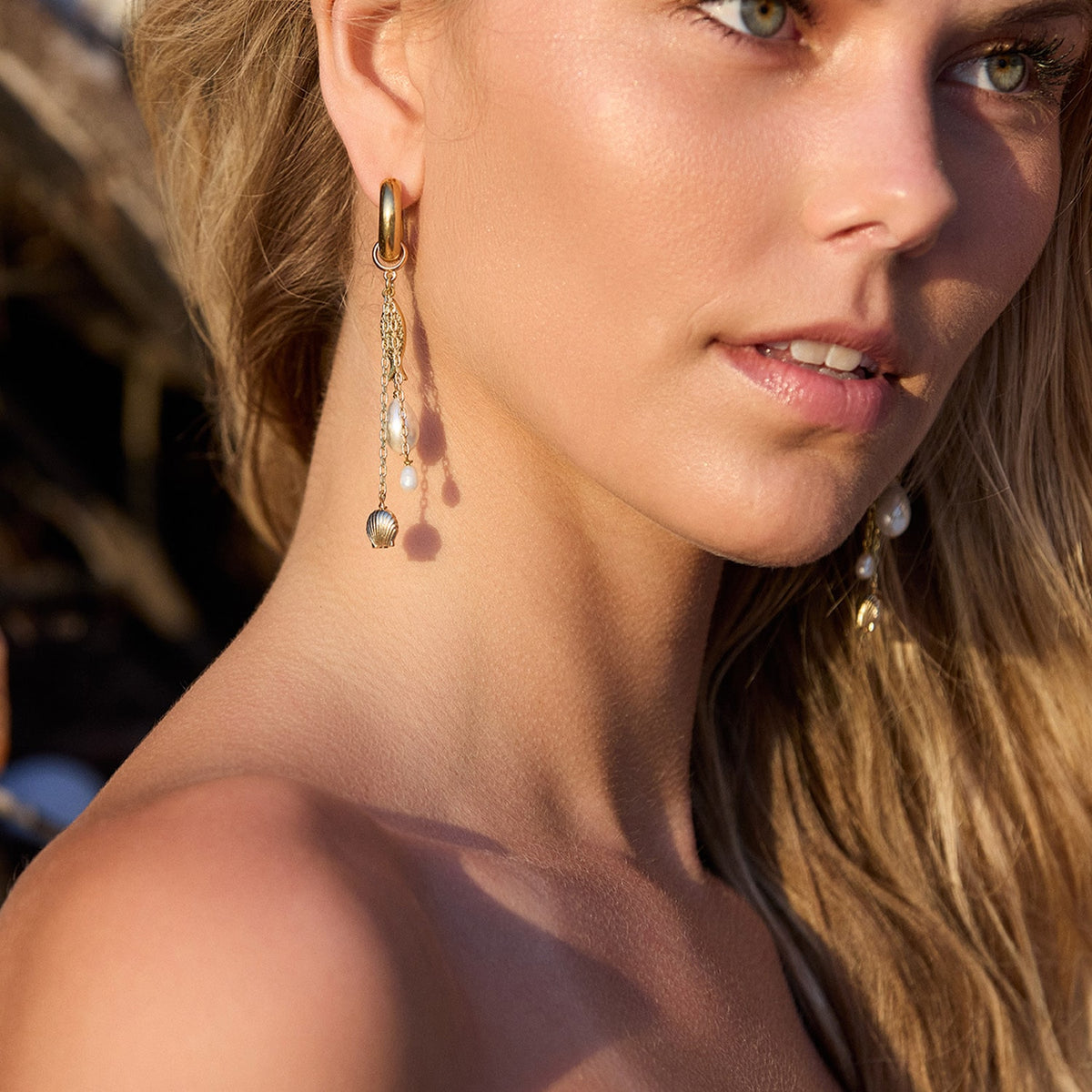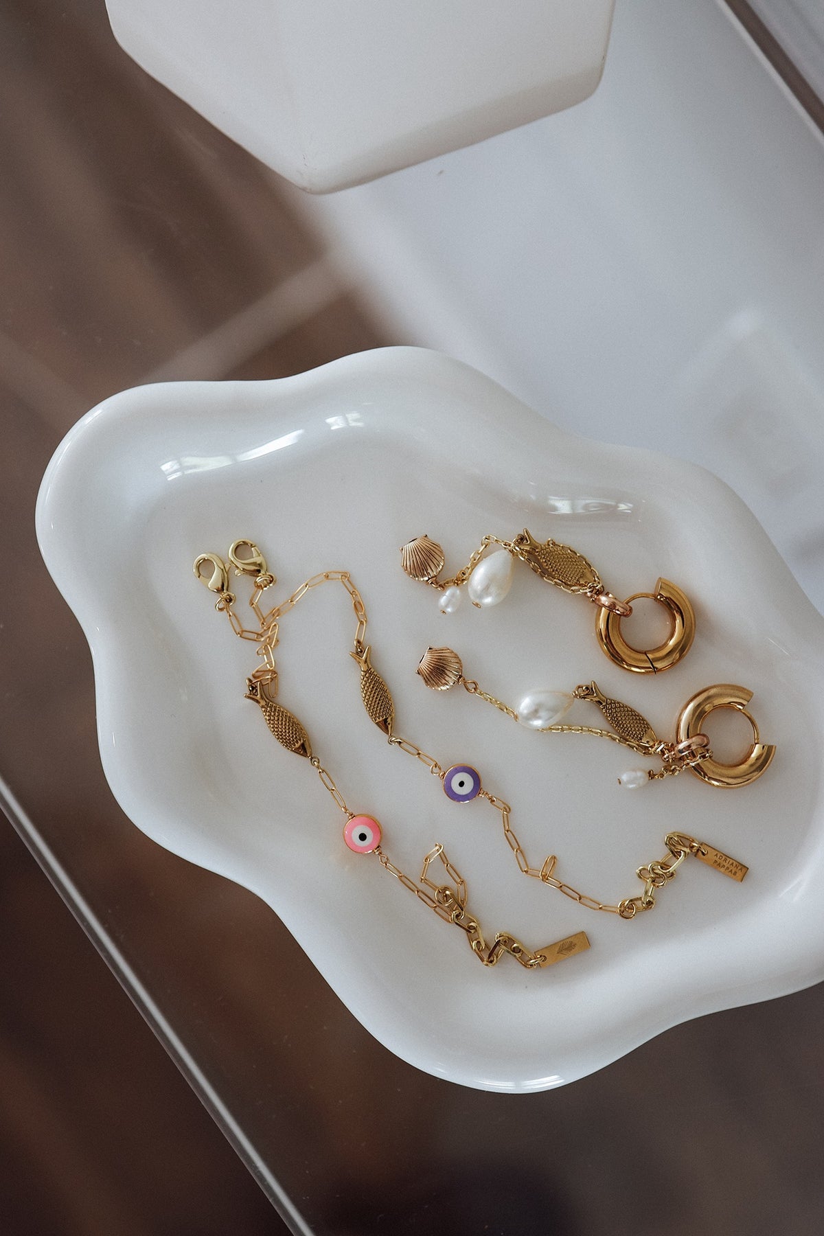 Style Notes: These Lucky Fish Charm Earrings by Adriana Pappas Designs are a unique and whimsical accessory that brings good vibes and a touch of nautical charm. The 14k gold-filled hoops are adorned with a freshwater pearl and a lucky fish charm, creating a playful and elegant dangle. Handmade with care, these earrings are a versatile piece that will quickly become one of your favorites.