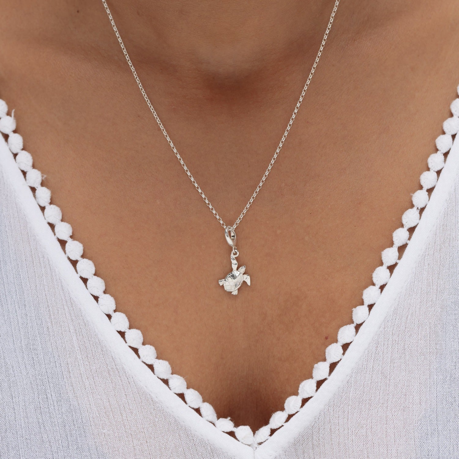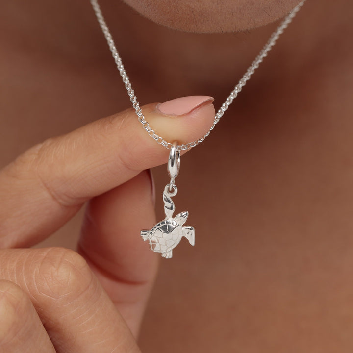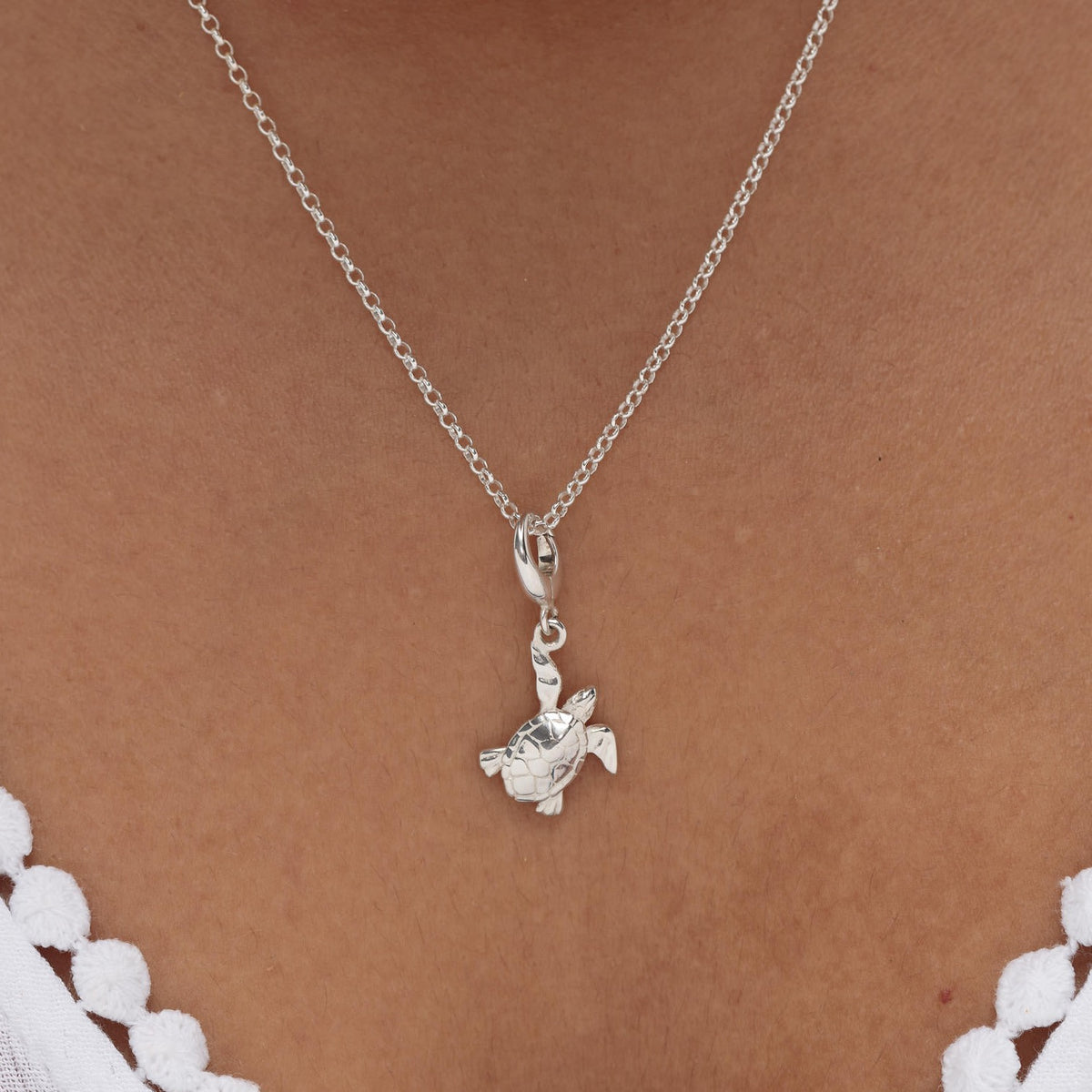 Recycled 925 sterling silver with rhodium-plated turtle charm. Includes clip-on clasp for compatibility with chains, bracelets, and charm carriers.