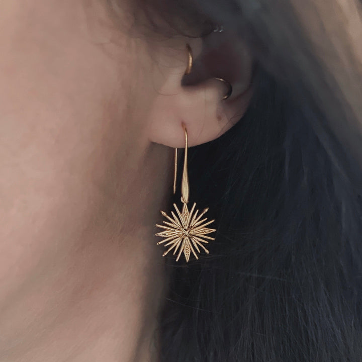 These Hoshi Earrings by In Cauda Venenum are fine hooks with a medallion shaped like a star with multiple branches. "Hoshi" means "star" in Japanese, and these earrings capture the essence of celestial beauty. Handmade in France from recycled 24k gold-plated brass, their distinctive geometric shape adds a touch of modern flair, elegantly complementing your individual style with a nod to vibrant culture and artistic energy.
