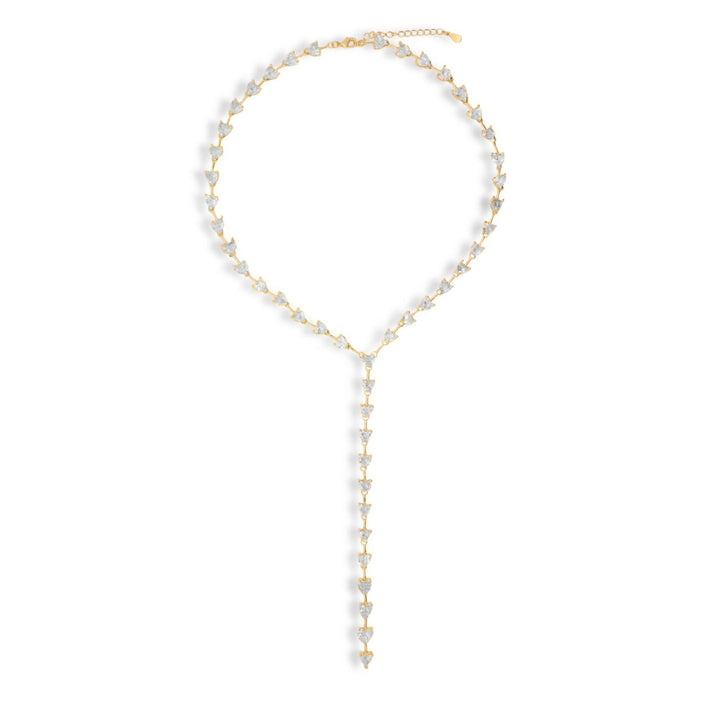 This necklace is made from 18k gold-plated brass and features a heart-shaped cubic zirconia charm. It has a Y-shaped design.
