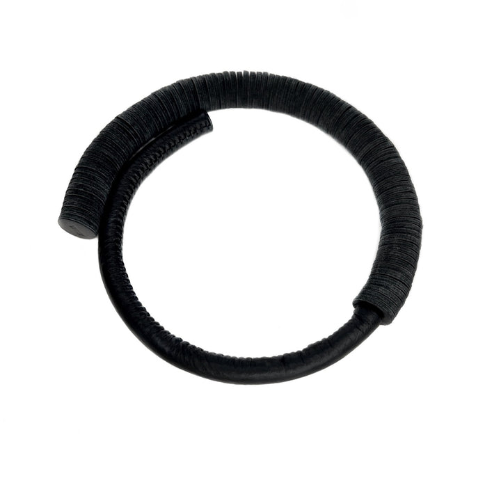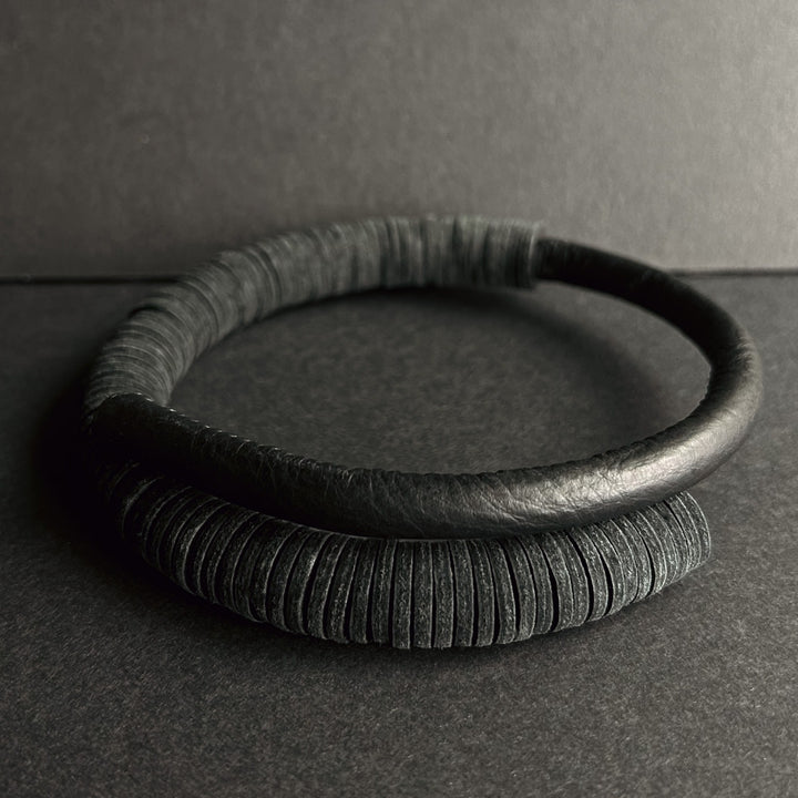 This Texture Fusion Leather Choker by Waiwai is a standout accessory with a striking yet understated design. Meticulously crafted using hand-stitched leather tube and intricately punched sequins, it offers a refined and tactile feel. With memory wire inside and no clasp, it ensures a perfect and comfortable fit for every neck size, allowing you to forget its presence while enhancing your everyday style.