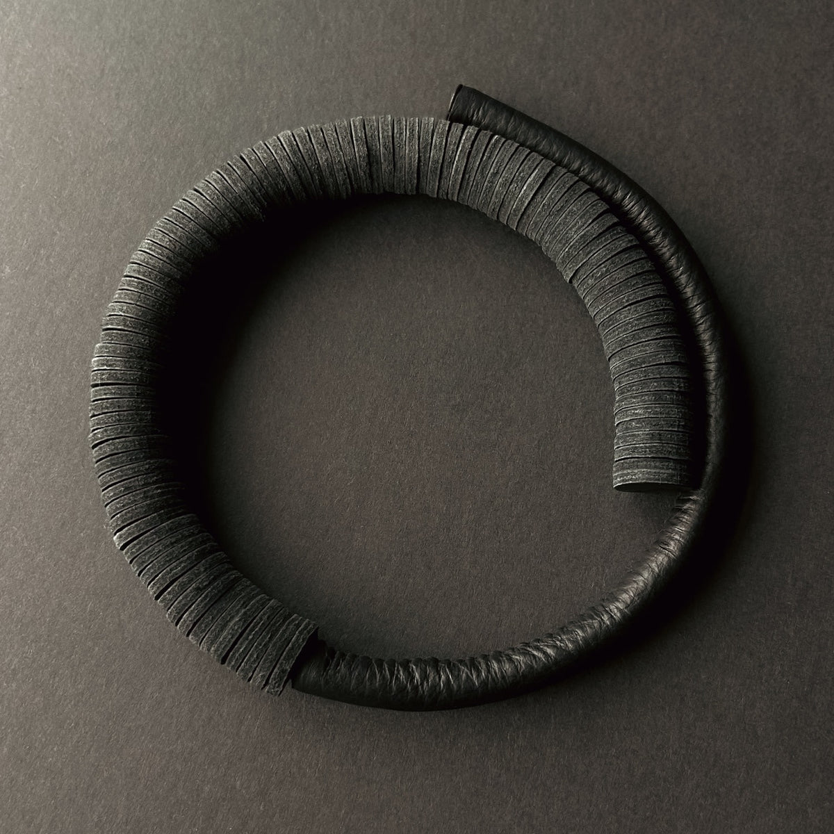 This choker is crafted from hand-stitched leather tube and intricately punched sequins. It features memory wire inside and has no clasp.