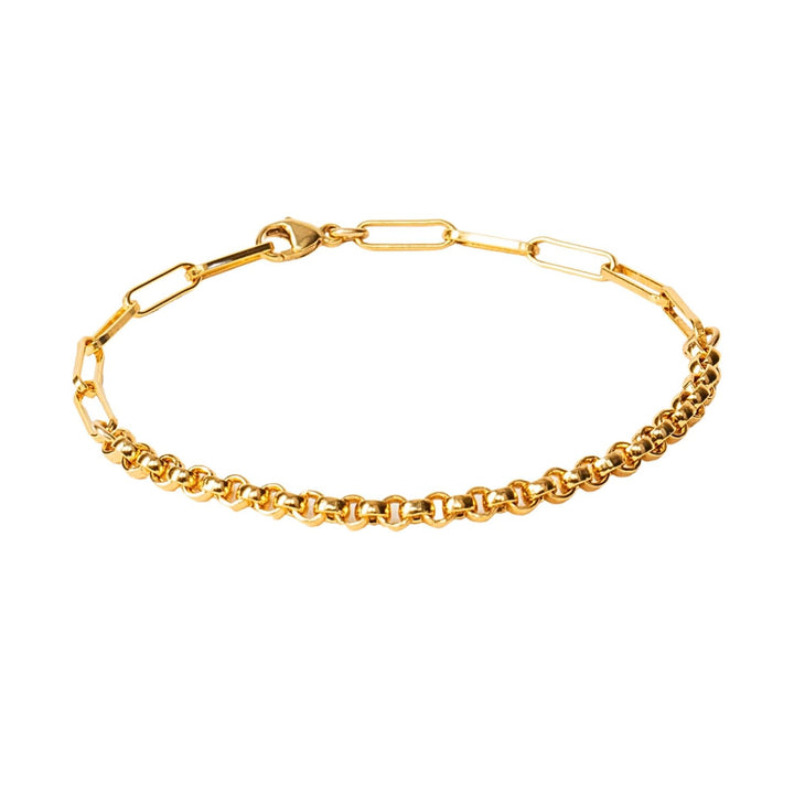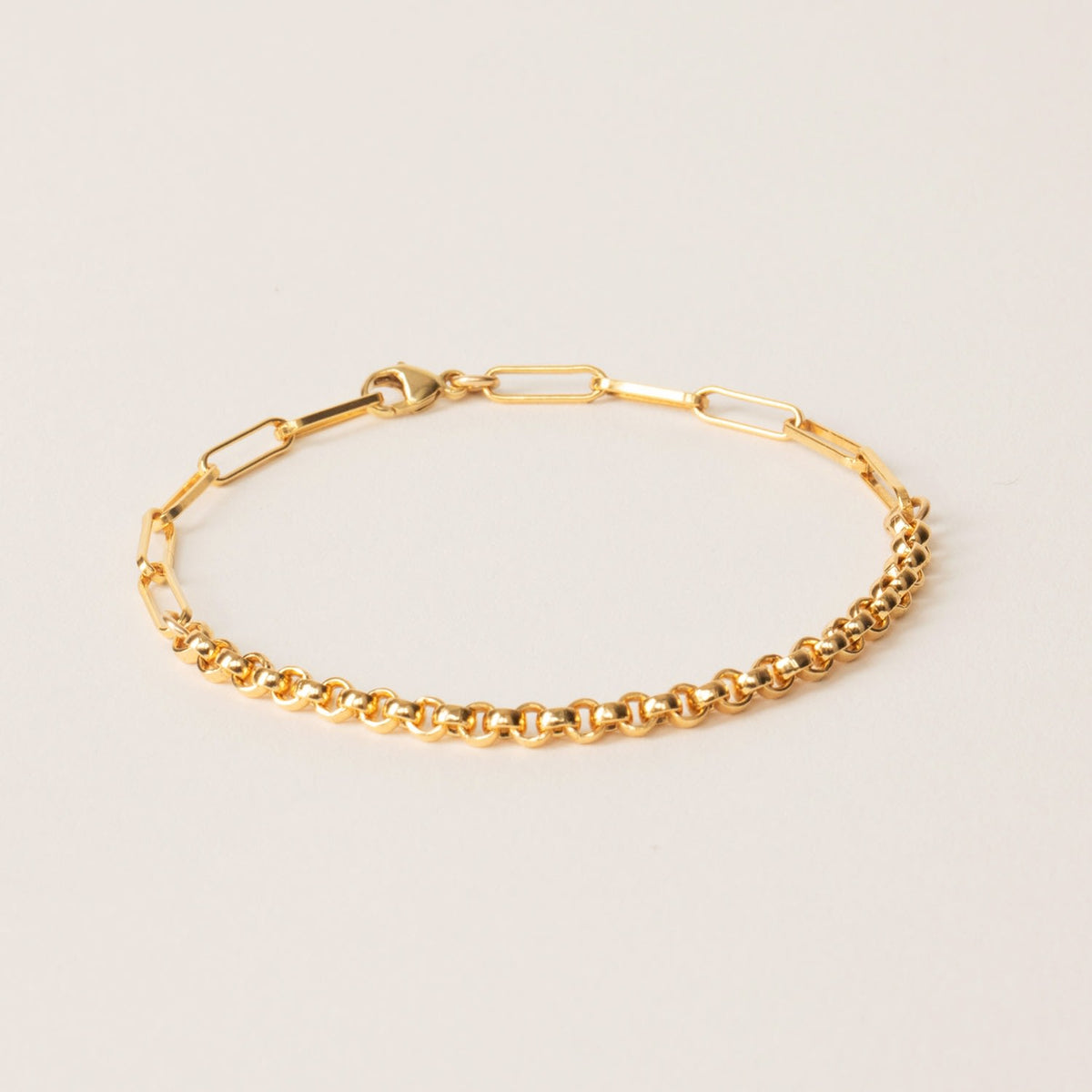 This Ava X Layla Gold Link Bracelet by Gwen Beloti Jewelry balances boldness with elegance. Featuring two distinctive link styles in one design, it shines equally when layered or worn solo, embodying modern sophistication.
