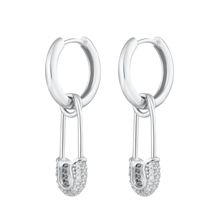 These hoop earrings are crafted from 100% recycled sterling silver with rhodium plating. They feature a dangling safety pin charm set with clear cubic zirconia stones and have a hinged clasp.
