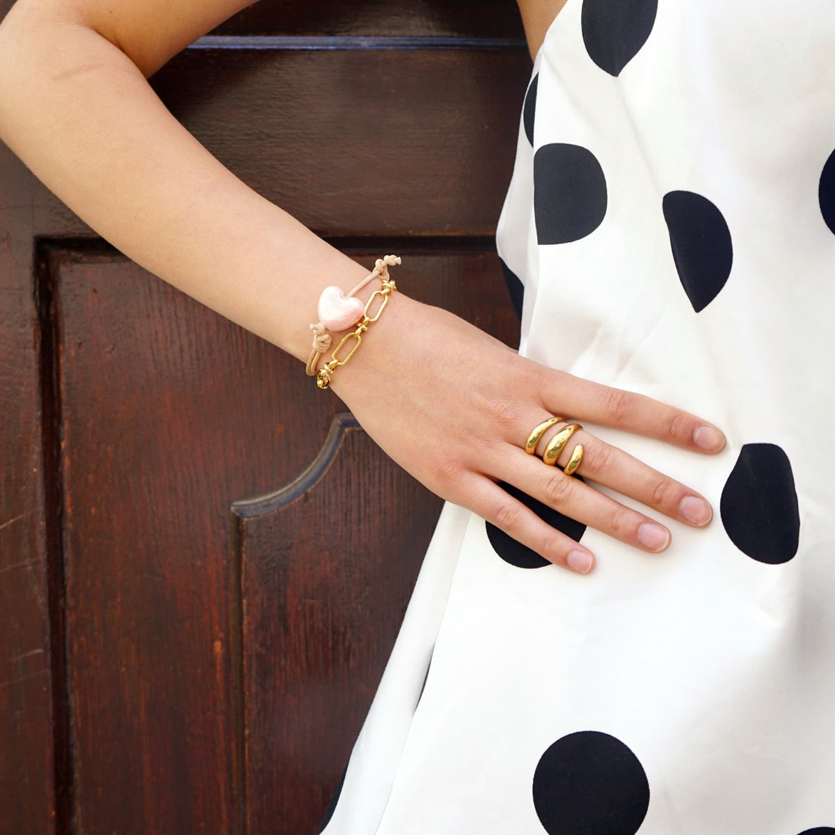 The Ceramic Heart Leather Bracelet by Smilla Brav is a unique and timeless accessory. Handmade in Germany, this bracelet is crafted from recycled stainless steel, genuine leather, and a handmade ceramic heart bead. The natural variations in the ceramic bead make each bracelet a one-of-a-kind creation. This piece is a celebration of love, sustainability, and individuality, adding a touch of understated elegance to any outfit.